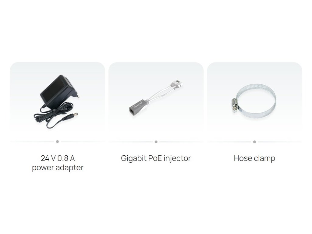 Obsah balení: napájecí adaptér 24 V/ 0,8 A, gigabitový PoE injektor, kovový stahovací pásek