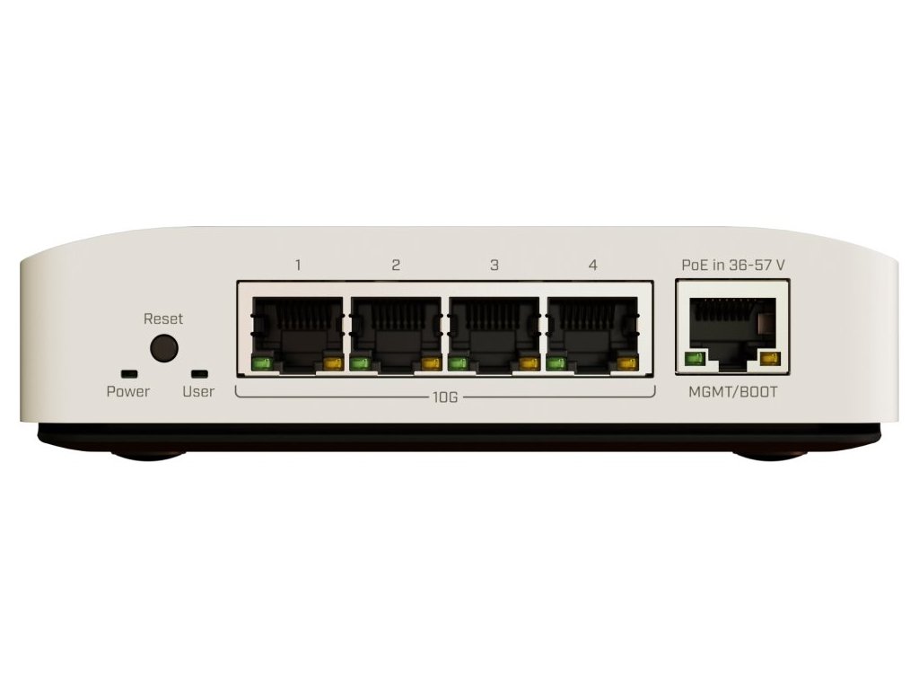 MikroTik CRS304-4XG-INCloud Router Switch CRS304-4XG-IN je dodáván v odolném, lehkém krytu a nabízí 4× 10GbE RJ-45 a 1× 1GbE RJ-45 port, fanless provedení. Disponuje procesorem ARM 64bit s přepínacím čipem Marvell Prestera (98DX2528), 512 MB RAM a 32 MB FLASH úložištěm. Nabízí funkce jako přesměrování portů, broadcast storm control, filtrování MAC, VLAN, zrcadlení provozu, omezení šírky pásma, L3 hardware offloading. Switch má zálohu napájení (dva zdroje). Poskytuje čtyři různé možnosti napájení: dva DC konektory (12–57 V), 2pinovou svorkovnici (12–57 V) a PoE-in. Přepínač automaticky vybírá zdroj napájení s nejvyšším napětím, čímž zajišťuje nepřerušovaný provoz. Podporuje jak pasivní (36–57 V), tak i aktivní (802.3at/af) PoE napájení. Součástí balení je adaptér pro montáž na DIN lištu a napájecí zdroj (48 V/ 0,95 A).