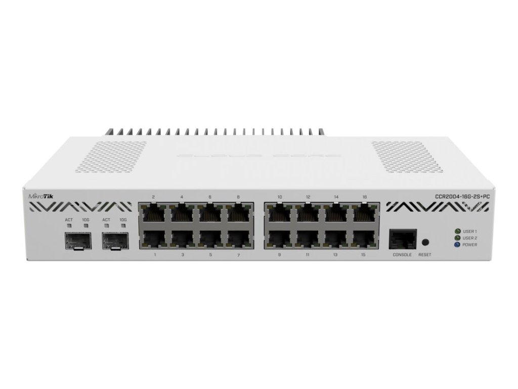 MikroTik Cloud Core Router CCR2004-16G-2S+PCCloud Core Router MikroTik CCR2004-16G-2S+PC se 4 GB paměti RAM s bezkonkurenčním výkonem, který poskytuje 4jádrový 64bitový ARM procesor AL32400 na frekvenci 1,2 GHz. Router má šestnáct GbE portů a dva 10G SFP+ sloty. Každý přepínací čip routeru má plně duplexní 10 Gb/s linku k procesoru, a díky tomu má nejlepší jednojádrový výkon v sérii CCR routerů. Další předností je duální redundantní napájení pro bezproblémový a stabilní provoz.