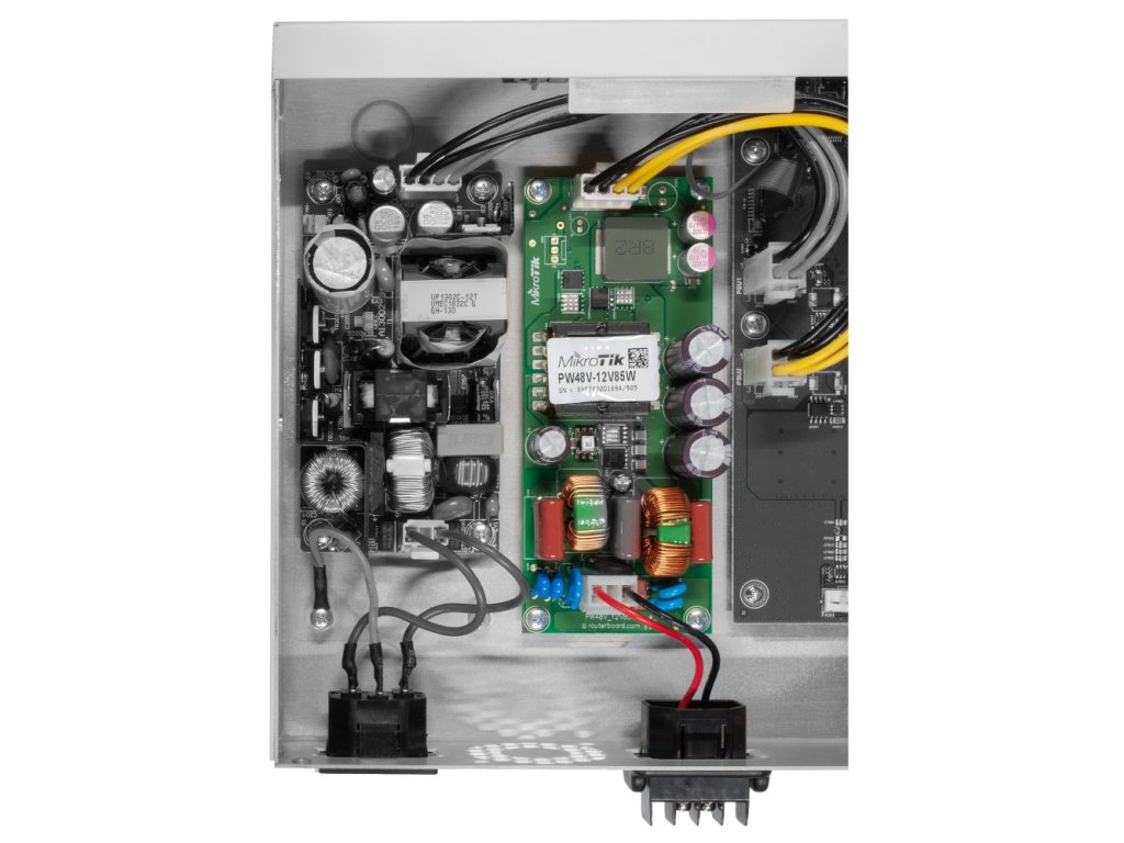 MikroTik PW48V-12V85WModulární napájecí zdroj ±48 V DC Open Frame pro Mikrotik Cloud Core Routery nové revize "r2". Celkový výkon zdroje je 85 W při napětí 12 V a maximálním proudu 7 A.