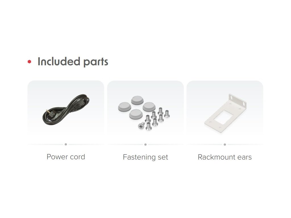 - 8× RJ-45 PoE+, 8× RJ-45 PoE++, 1× konzolový port RJ-45, 4× 10G SFP+, 1× GbE RJ-45