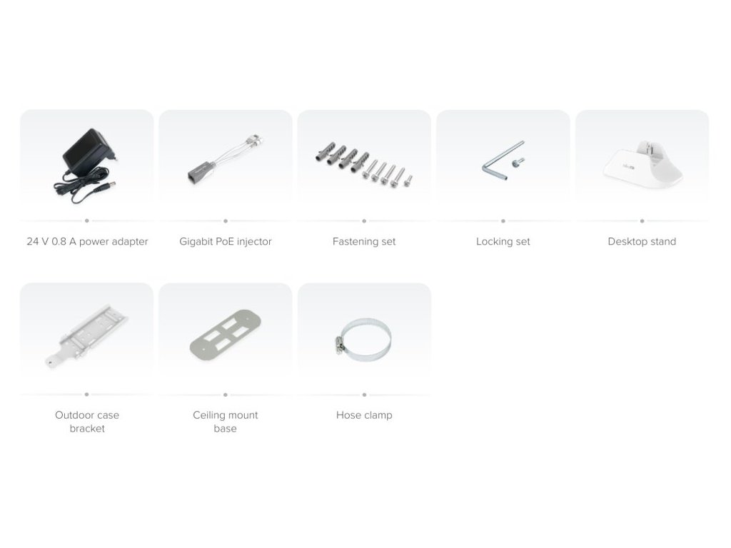 Balení obsahuje gigabitový PoE injektor, napájecí adaptér, sadu šroubů a hmoždinek, zabezpečovací šroub, stojánek na stůl, venkovní držák, držák na strop a svorka.
