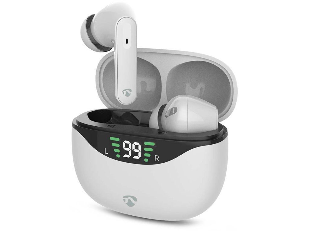 NEDIS bezdrátová sluchátka + mikrofon/ TWS/ BT/ výdrž 30 hod/ 100 dB/ ovládání dotykem/ nabíjecí pouzdro/ USB-C/ bílé