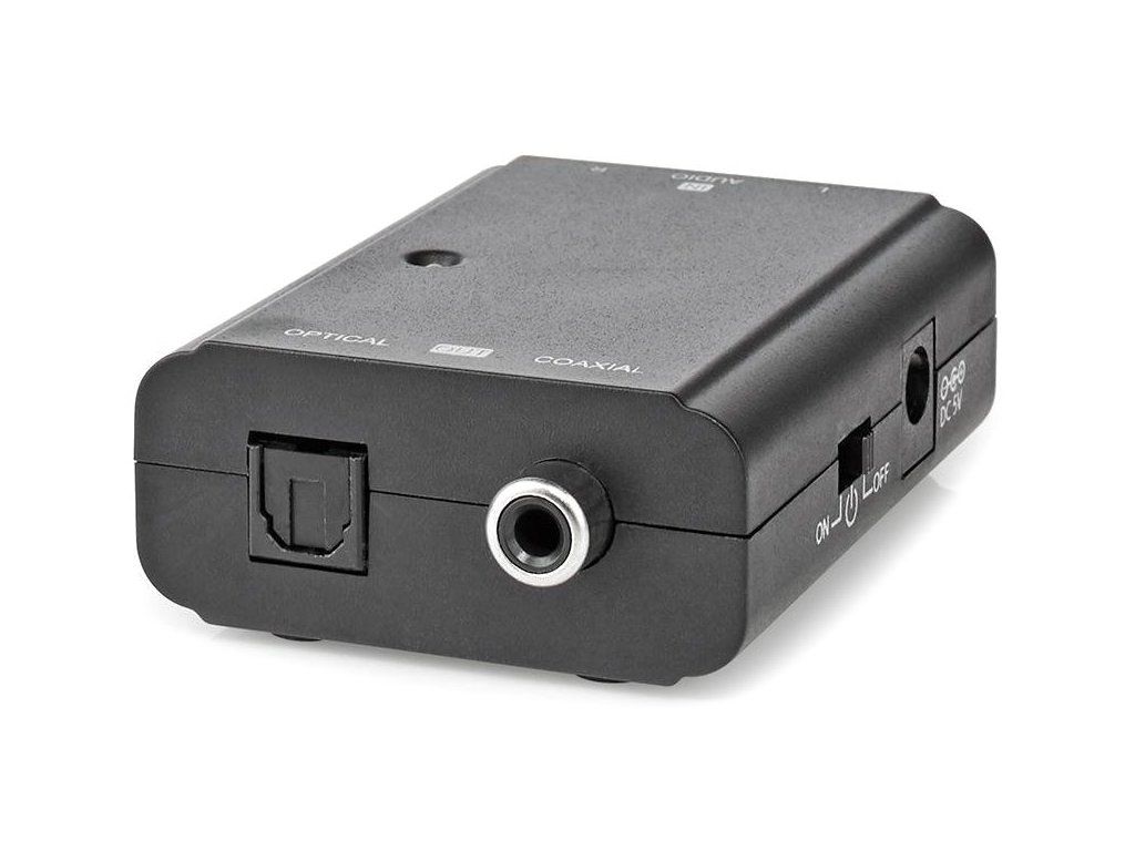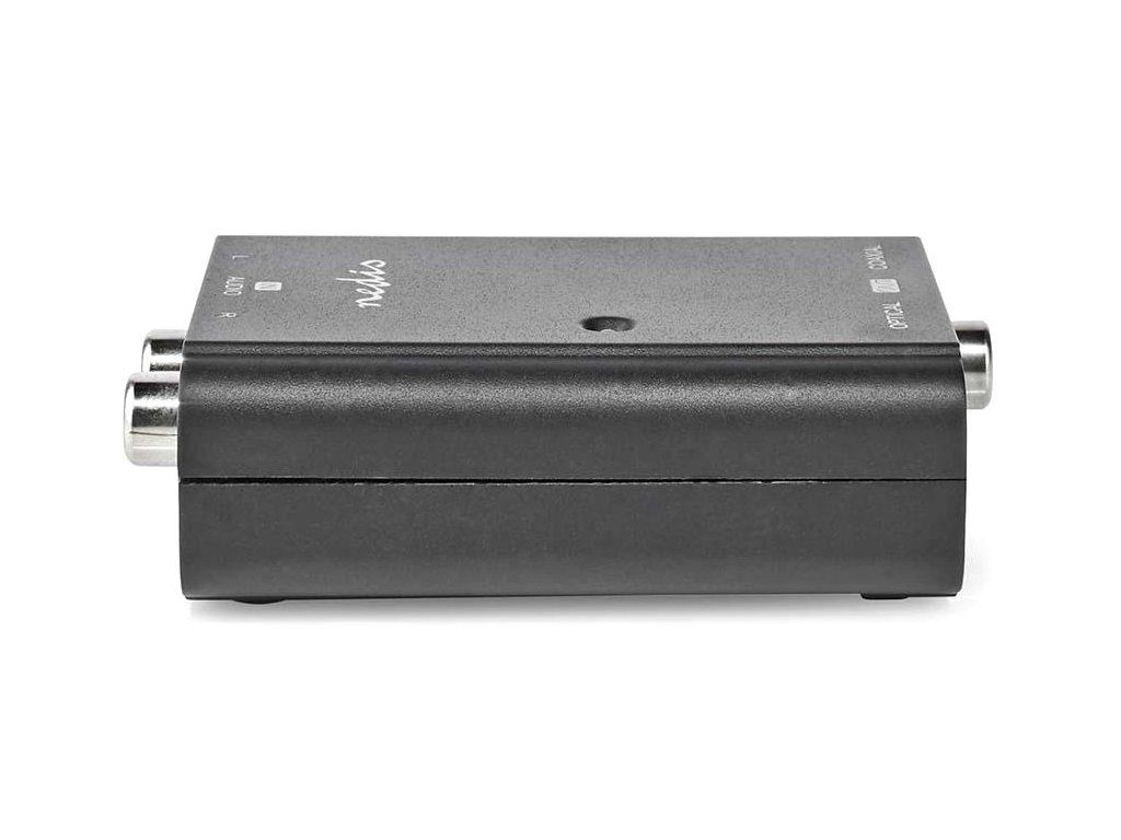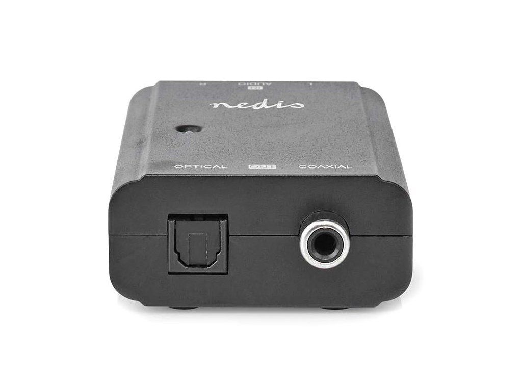Nedis ACON2508BKTento digitální audio převodník převádí analogový stereofonní zvukový signál na digitální Toslink nebo RCA zvukový signál na vstupním portu přijímače nebo zesilovače. Dodává se s nabíjecím kabelem DC-USB (adaptér není součástí balení).