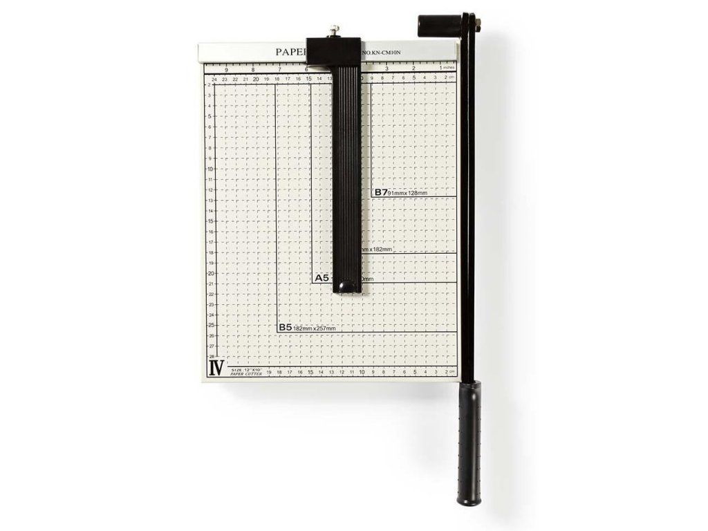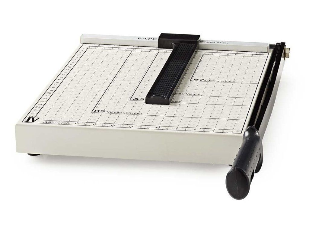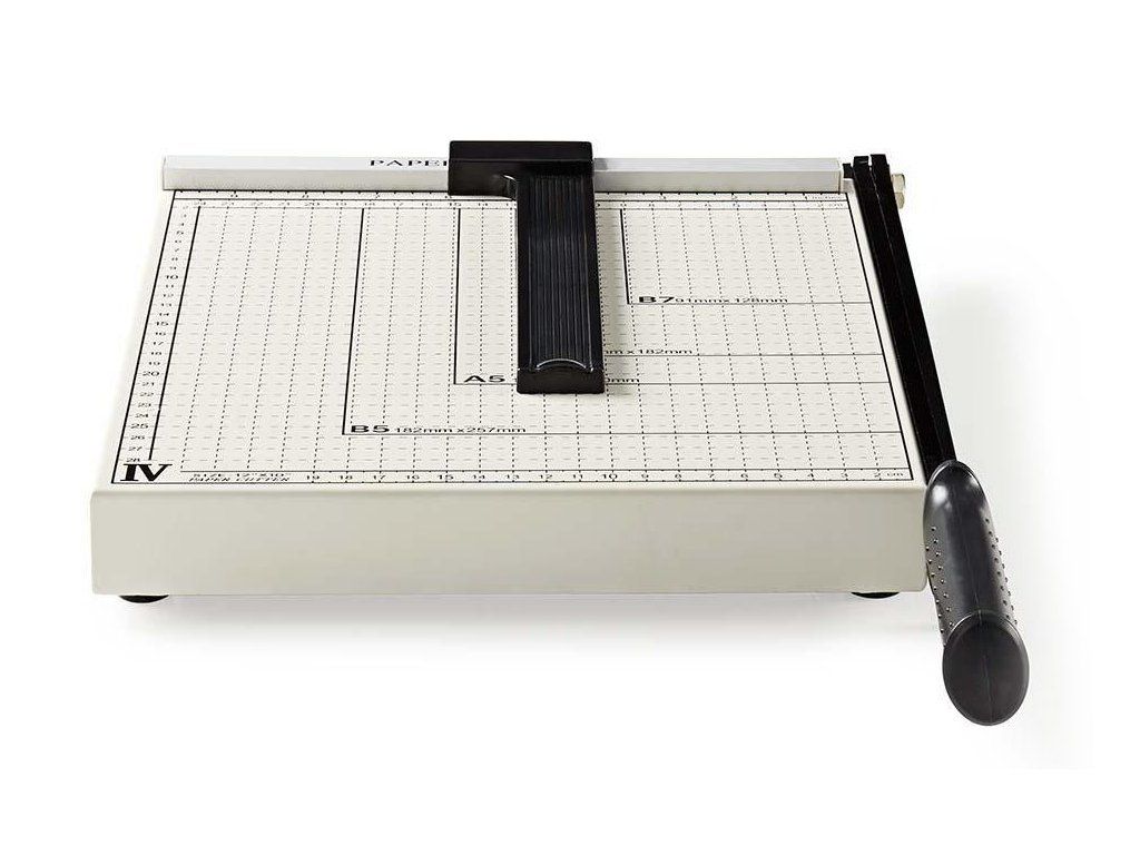 Nedis PACU110A4Řezačka papíru a fotopapíru formátu A4 s bezpečnostním zámkem. Deska o rozměrech 300 × 250 mm disponuje měřítkem v centimetrech i palcích a vyznačenými standardními velikostmi papíru.