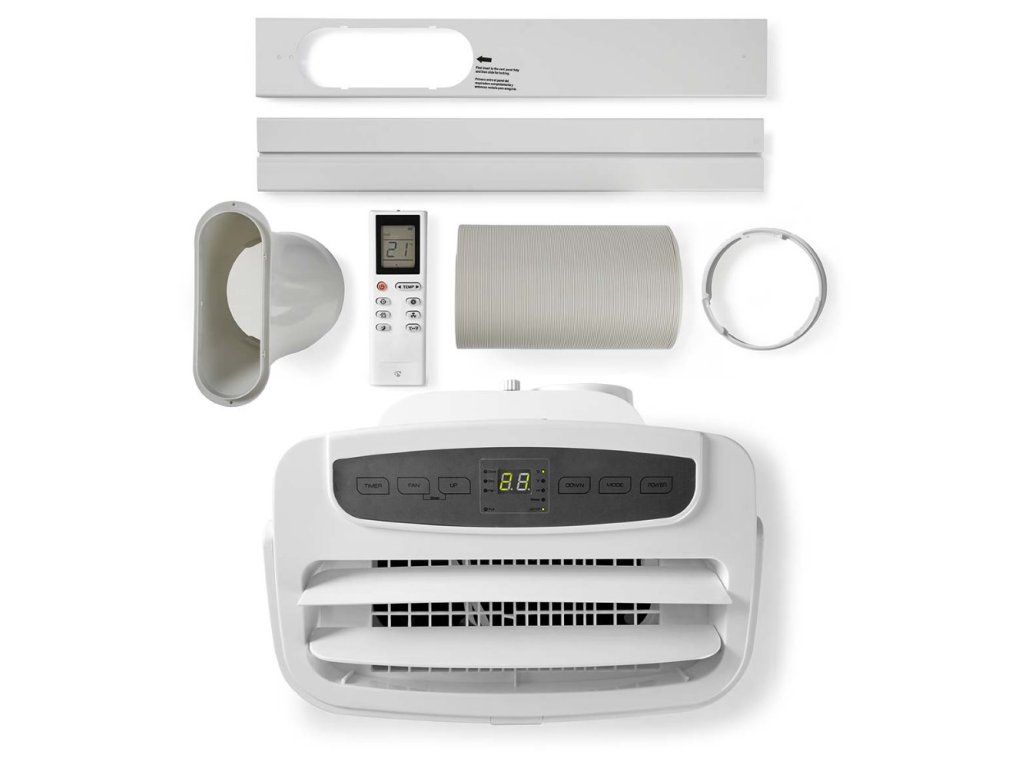 Součástí balení je dálkové ovládání, hadice o délce 1,5 m pro odvod tepla, 2x nástavec na hadici a okenní sada.
