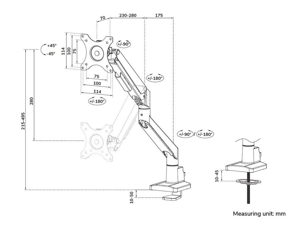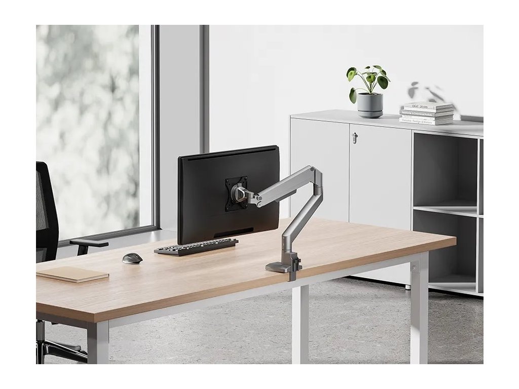 Neomounts DS70-250SL1Plně pohyblivý stolní držák pro plochý nebo zakřivený monitor s úhlopříčkou 17" až 35" a maximální hmotností 9 kg (8 kg pro zakřivený monitor). Všestranná technologie naklápění, otáčení a rotace umožňuje vytvořit optimální pozorovací úhel. Držák má nastavitelnou výšku 21,5–49,5 cm, hloubku 7–52,5 cm a je vhodný pro obrazovky, které odpovídají vzoru otvorů VESA 75 × 75 až 100 × 100 mm. Potěší také systém pro úhledné vedení kabelů. Balení obsahuje stolní svorku i průchodku.