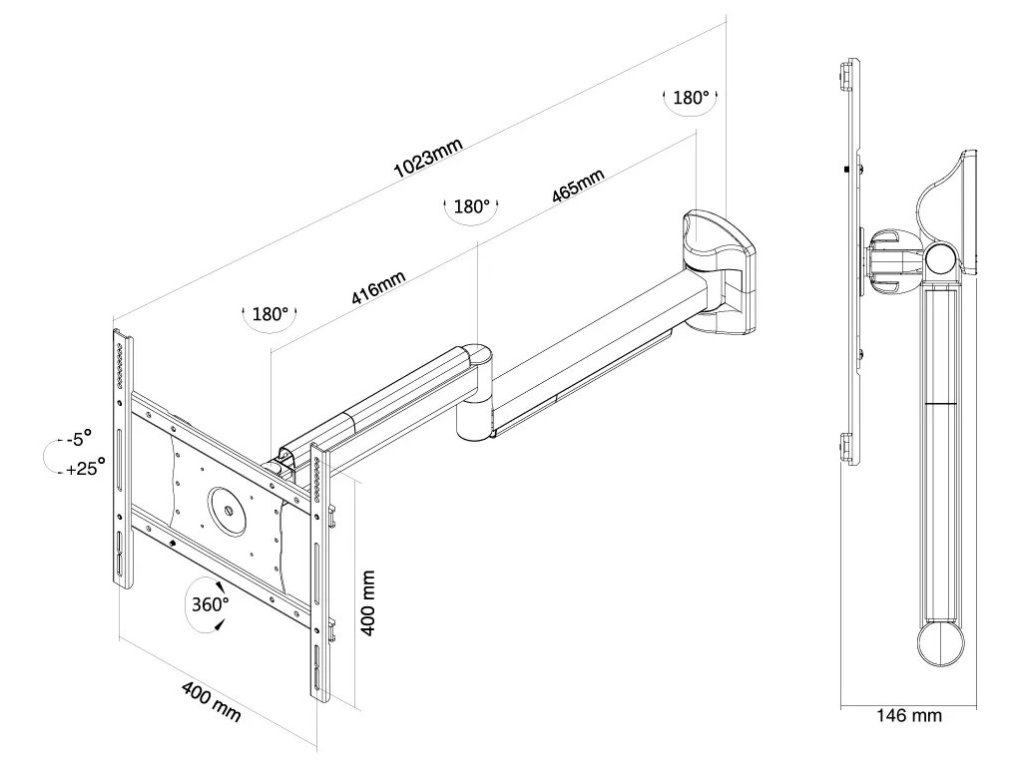 Rozměry VESA: 100 × 100, 100 × 200, 200 × 100, 200 × 200, 200 × 300, 200 × 400, 300 × 100, 300 × 200, 300 × 300, 400 × 200, 400 × 300, 400 × 400 mm
