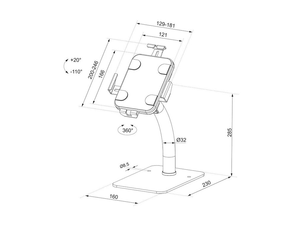 Neomounts DS15-625WH1Stolní držák pro tablet s úhlopříčkou 7,9" až 11" umožňuje rotaci 360° a snadné přepínání mezi orientací na výšku a na šířku. Pro pohodlné sledování lze navíc také naklonit v rozsahu -110° až +20°. Pomocí posuvné lišty na zadní straně lze tablet dokonale vyrovnat na střed držáku. Protiskluzové podložky chrání tablet před jakýmkoli poškrábáním, zatímco výškově a šířkově nastavitelné svorky zajišťují jeho bezpečné a pevné umístění. Držák lze vybavit zámkem proti krádeži či přišroubovat základnu ke stolu pro větší bezpečnost. Kabely lze úhledně vést pomocí vnitřního systému správy kabelů.