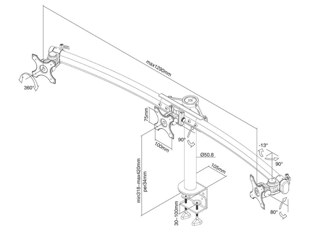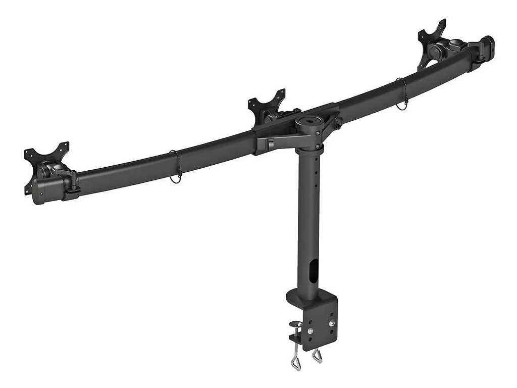 - Plně pohyblivý stolní držák pro 3 ploché obrazovky 10"–27"