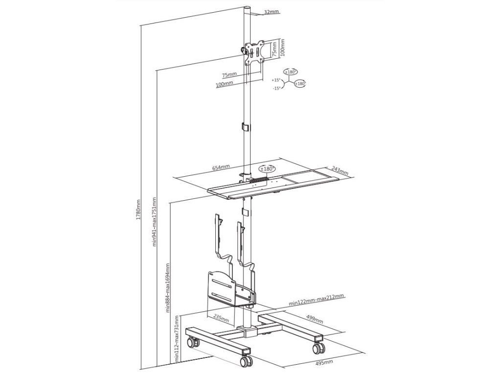 Neomounts FPMA-MOBILE1700Pojízdná pracovní stanice pro ploché obrazovky s úhlopříčkou od 10" do 32", klávesnici, myš a počítač. Technologie naklápění, otáčení a rotace umožňuje nastavit ideální úhel pohledu. Držák je ručně výškově nastavitelný od 94 do 175 cm a nabízí nosnost až 8 kg pro obrazovku, 10 kg pro počítač a 2 kg pro klávesnici a myš. Intuitivní systém správy kabeláže minimalizuje nepořádek. Veškerý instalační materiál je součástí výrobku.