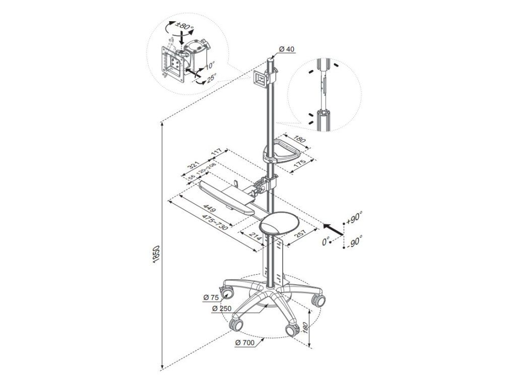 Neomounts FPMA-MOBILE1800Pojízdná pracovní stanice pro ploché obrazovky s úhlopříčkou od 10" do 27" a hmotností až 6 kg, klávesnici, myš a počítač. Technologie naklápění umožňuje nastavit ideální úhel pohledu. Intuitivní systém správy kabeláže minimalizuje nepořádek. Veškerý instalační materiál je součástí výrobku.