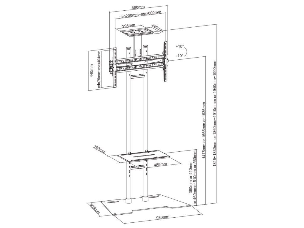 Rozměry VESA: 200 × 200, 200 × 300, 200 × 400, 300 × 200, 300 × 300, 400 × 200, 400 × 300, 400 × 400, 400 × 600, 440 × 400, 500 × 400, 600 × 400 mm