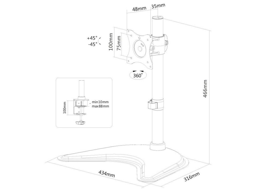Neomounts NM-D335BLACKFlexibilní VESA stojan pro plochý LCD monitor o velikosti 10" až 30" a nosnosti do 10 kg. Stojan je možné manuálně zvýšit až do 46 cm a je vhodný pro obrazovku, která splňuje vzor otvorů VESA 75 × 75 nebo 100 × 100 mm. Různé vzory otvorů lze pokrýt pomocí VESA adaptérů. Veškerý instalační materiál je součástí výrobku.