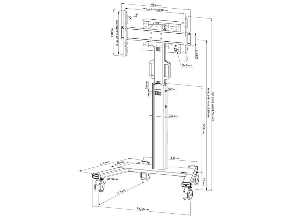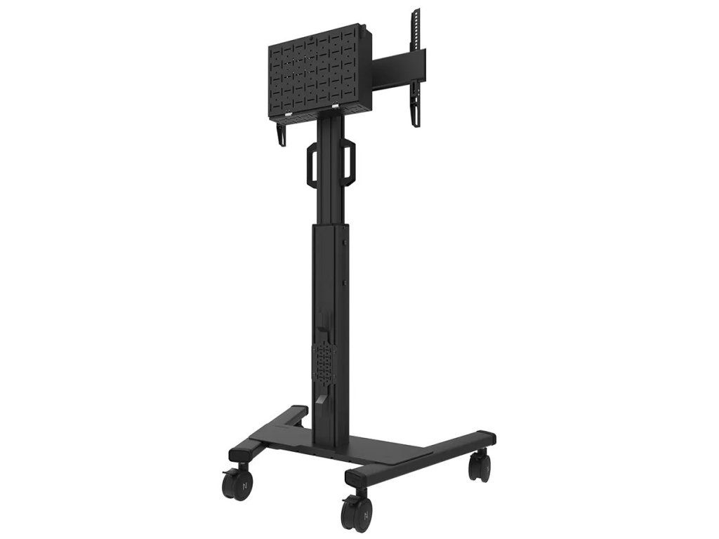 Neomounts FL50S-825BL1Mobilní podlahový stojan pro ploché obrazovky s úhlopříčkou od 37" do 75" a hmotností až 70 kg. Nabízí manuální nastavení výšky (114,5–153,5 cm) a možnost náklonu (0–5°) pro vytvoření optimálního pozorovacího úhlu. Pro snadný přesun je vybaven rukojeťmi a čtyřmi robustními kolečky o průměru 10 cm. Ve spodní části jsou k dispozici otvory pro uchycení napájecí lišty. Součástí balení je uzamykatelná přihrádka pro počítač s otvorem pro kabely.
