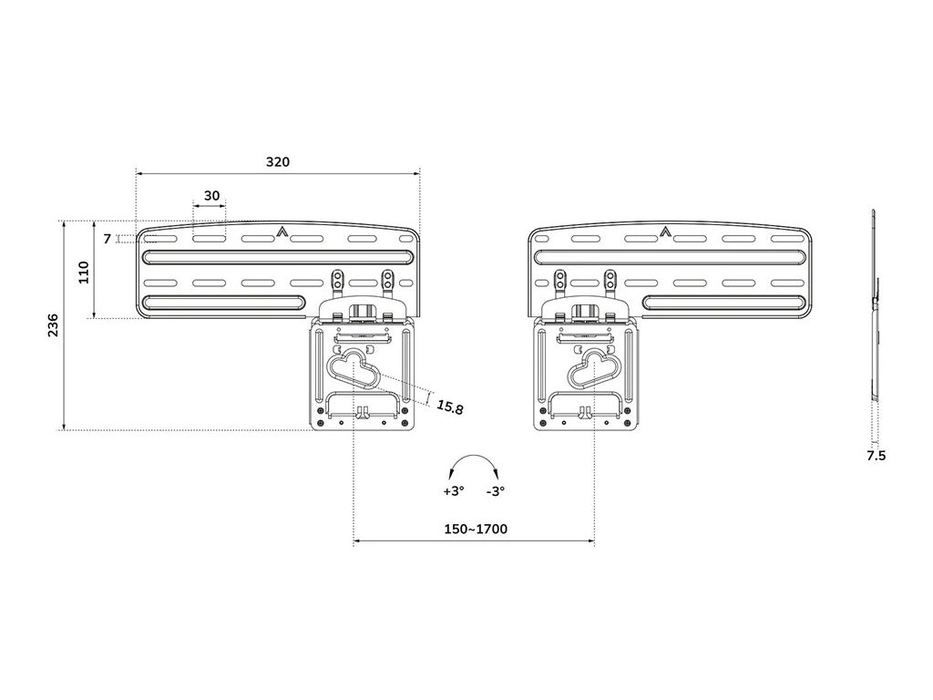 Rozměry VESA: 200 × 100, 200 × 200, 200 × 300, 200 × 400, 300 × 100, 300 × 200, 300 × 300, 300 × 900, 350 × 350, 400 × 200, 400 × 300, 400 × 400, 400 × 500, 400 × 600, 440 × 400, 460 × 640, 500 × 400, 600 × 200, 600 × 300, 600 × 400, 600 × 500, 600 × 600, 680 × 300, 800 × 200, 800 × 400, 800 × 500, 800 × 600, 800 × 800, 900 × 600, 1000 × 400, 1000 × 600, 1000 × 700, 1000 × 800, 1200 × 600, 1200 × 800, 1200 × 900, 1400 × 800, 1500 × 600, 1600 × 600 mm