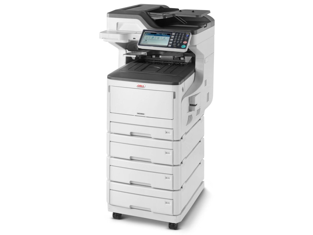 OKI MC883dnvMultifunkční barevná tiskárna formátu A3 nabízí rychlost tisku až 20 stran za minutu ve formátu A3 a až 35 stran za minutu ve formátu A4 při rozlišení 1200 DPI. Disponuje vestavěným skenerem s rozlišením až 600 DPI a automatickým podavačem listů. Samozřejmostí je automatický duplexní tisk. Ovládání tiskárny je velmi snadné díky 7" barevnému dotykovému displeji. Tento model je vybaven čtyřmi zásobníky na papír s celkovou kapacitou až 2005 listů a základnou s kolečky. Pro připojení do sítě nabízí tiskárna RJ-45 port a pro případ rychlého připojení USB médií nabízí také dva USB porty. Tiskárnu lze také využít jako fax.
