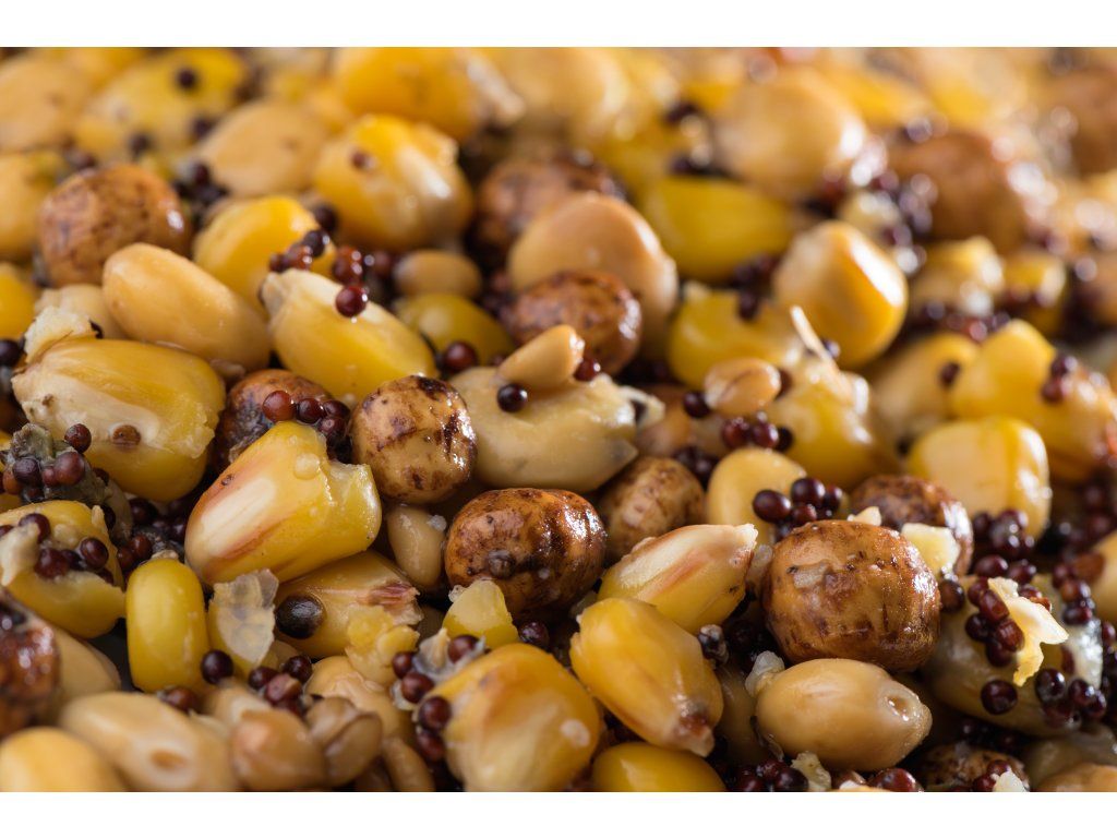 Složení: kukuřice, pšenice ,řepka, lupina, Tygří ořech a konopné semínko.