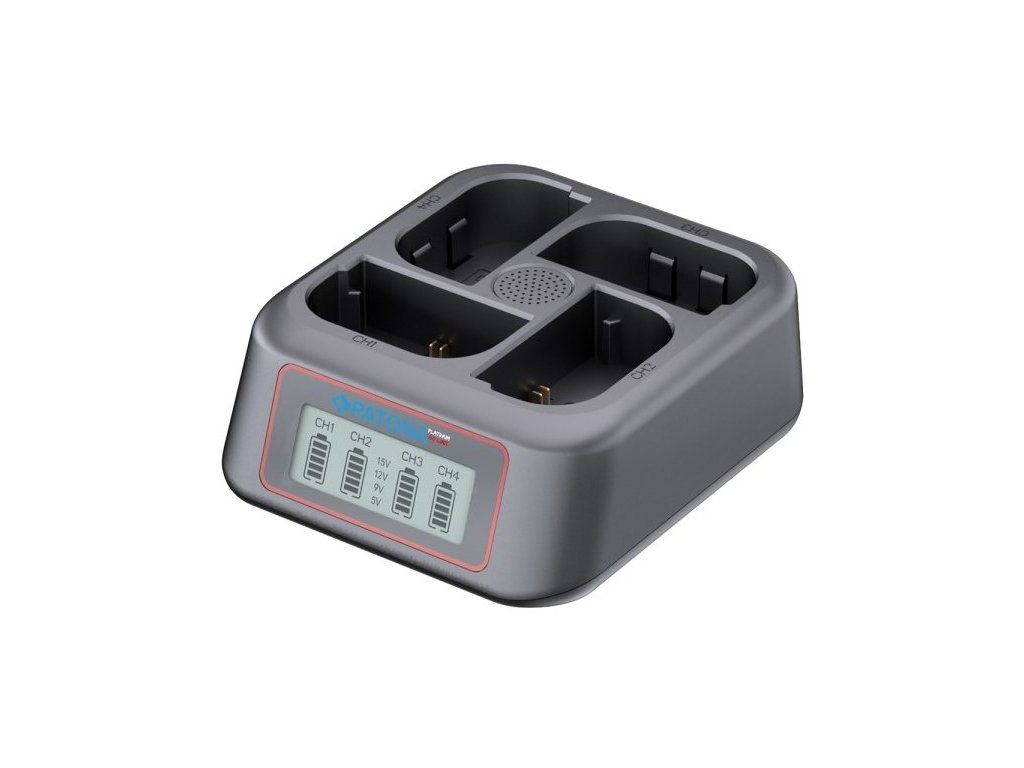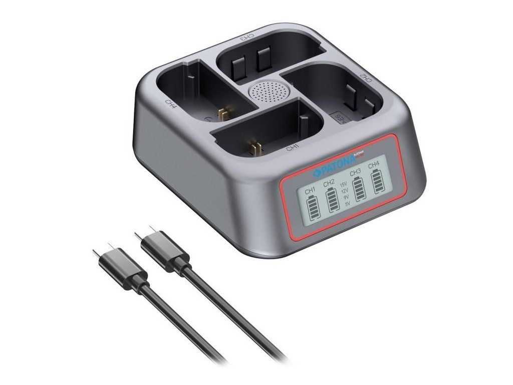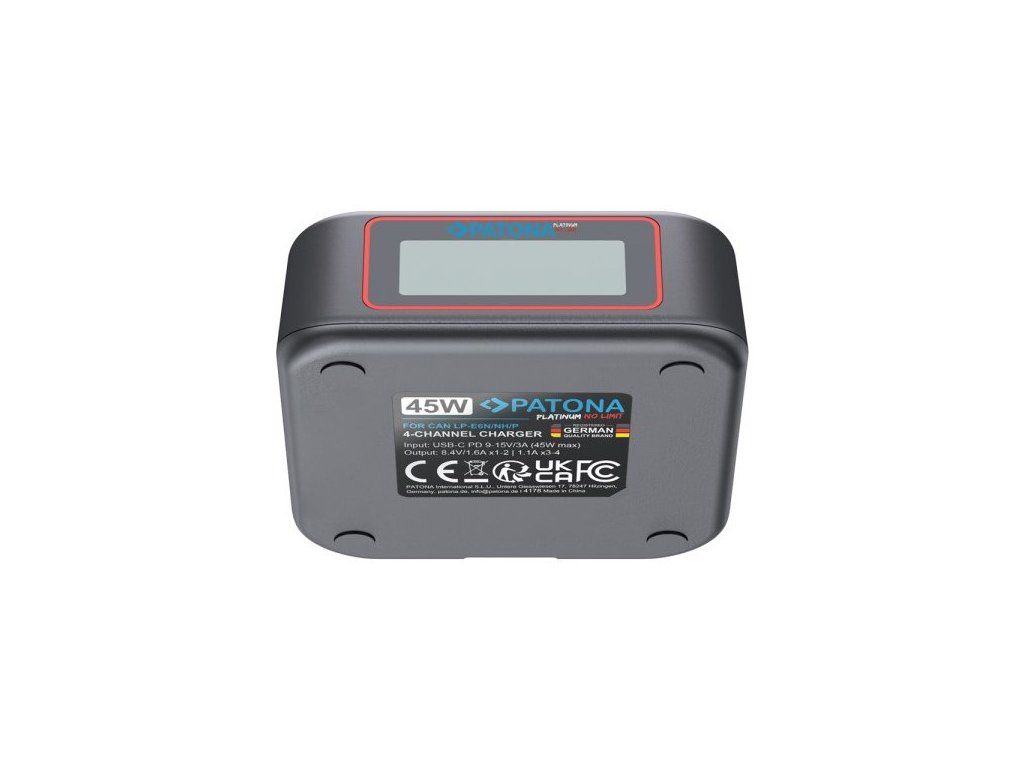 Profesionální nabíječka PATONA umožňuje současné nabíjení až 4 baterií Canon LP-E6, LP-E6N, LP-E6P a LP-E6NH z jakéhokoli USB-C zdroje. Díky podpoře protokolů Power Delivery a Quick Charge s maximálním vstupním výkonem 45 W zajišťuje rychlé a efektivní nabíjení. Integrovaný LCD displej přehledně zobrazuje stav nabíjení jednotlivých baterií.