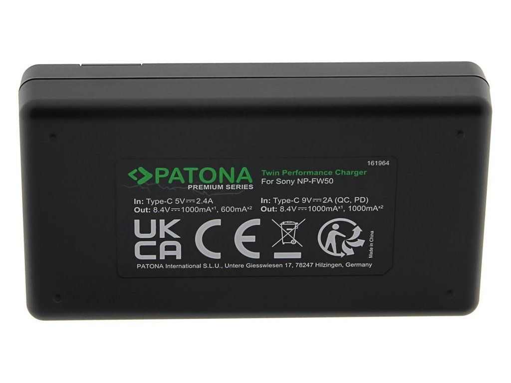 PATONA pro 2 baterie Sony NP-FW50S rychlonabíječkou Patona DUAL lze nabíjet současně 2 baterie najednou, bez ohledu na to, zda mají obě baterie stejnou kapacitu. Nabíječky jsou vyráběny dle nejvyšších evropských standardů kvality a vyznačují se extrémně dlouhou životností. Nabíječku lze napájet skrze USB typ C port.