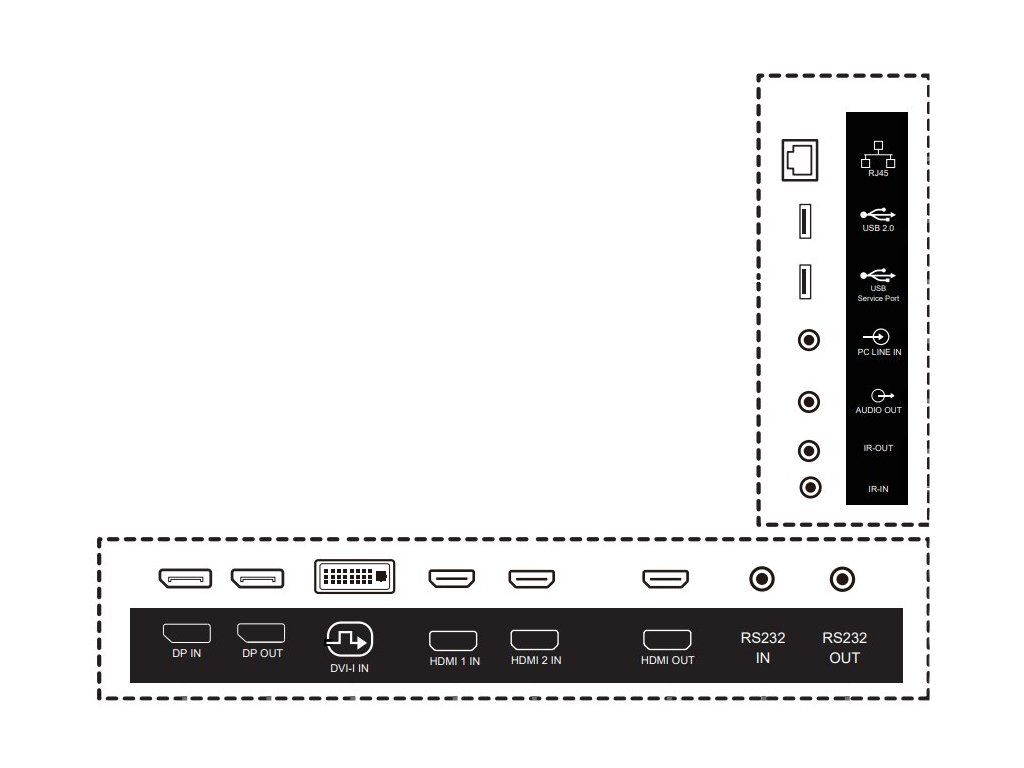Rozhraní: 2x HDMI vstup, 1x HDMI výstup, 1x DisplayPort vstup, 1x DisplayPort výstup, 1x DVI-I, 1x RJ-45, 2x USB 2.0, 1x audio vstup, 1x audio výstup, 1x RS-232 vstup, 1x RS-232 výstup, 1x IR vstup, 1x IR výstup