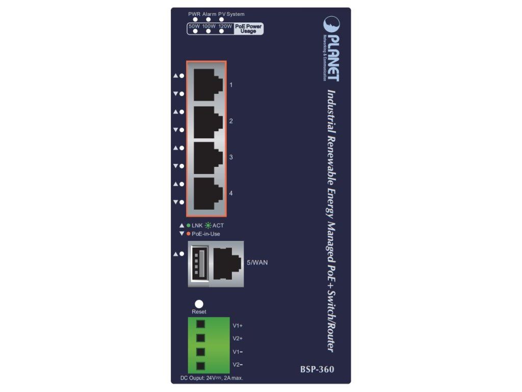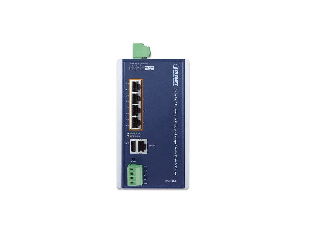 PLANET BSP-360 v3Solární napájecí PoE+ router s přepínačem (switch) a integrovaným MPPT regulátorem, 4x RJ-45 10/100/1000 Base-T s PoE+ IEEE 802.3af/at (36 W/port), 120 W PoE budget, 1x RJ-45 10/100/1000 Base-T (WAN v Gateway režimu), 1x USB (záloha konfigurace).