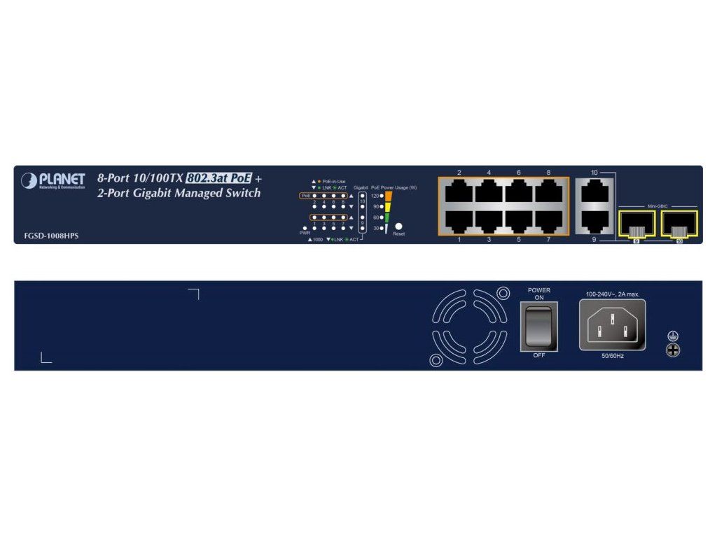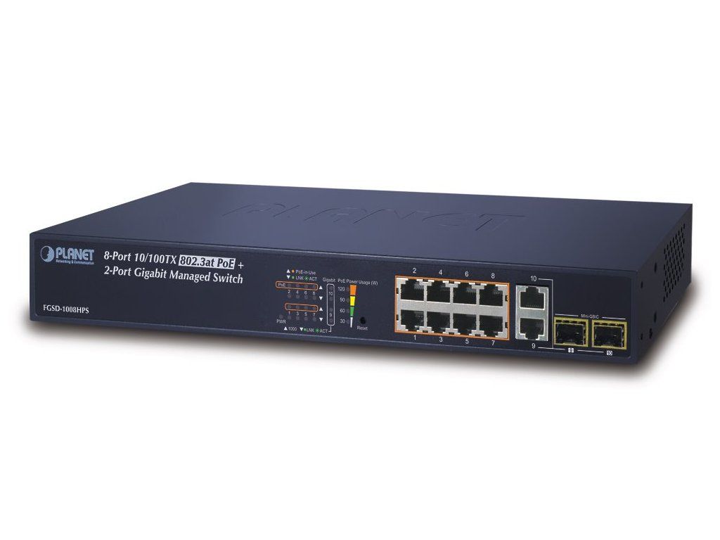 PLANET FGSD-1008HPSPoE switch se 2 SFP porty 1000Base-X (sdílené s 9. a 10. portem), 8 RJ-45 porty 10/100Base-TX s možností napájení dalších IEEE 802.3af/at zařízení a celkovým napájecím výkon 125 W.