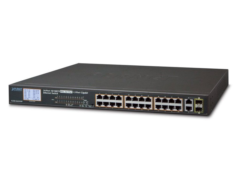 Planet FGSW-2622VHP2 Gigabitové porty 1000Base-TP/SFP. 24 portů 10/100Base-TX s možností napájení dalších IEEE 802.3at zařízení, celkový výkon 300W. Extend mód pro spojení rychlostí 10Mb/s do vzdálenosti až 150-250m na UTP dle použitého vedení včetně napájení PoE.
