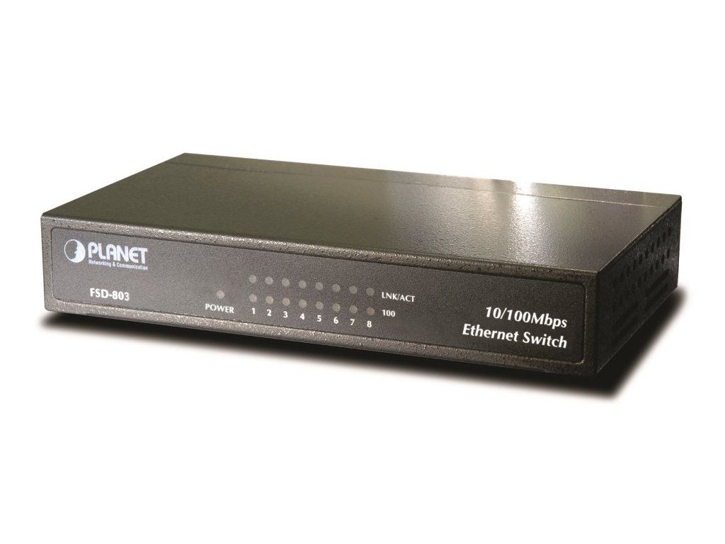 Planet FSD-8038portový přepínač. 8 portů 10/100 Base-TX. Automatická detekce 10/100Mbps, desktop. Miniaturní rozměr, kovová skříň, bez ventilátorů.