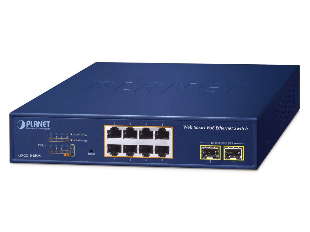 PLANET GS-2210-8P2SSpravovatelný PoE+ switch nabízející 8 portů 10/100/1000 Base-T a 2 SFP sloty 100/1000 Base-X. Všechny RJ-45 porty podporují napájení 802.3at PoE+ s celkovým výkonem až 120 W.