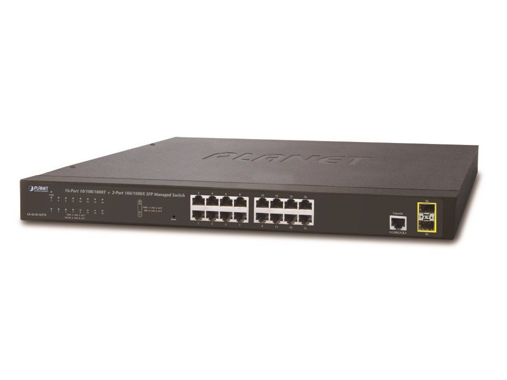 PLANET GS-4210-16T2SSpravovatelný přepínač 16 portů 1000Base-T, 2x SFP porty 100/1000Base-X. Web/SNMPv3/telnet správa, podpora IPv4/IPv6.
