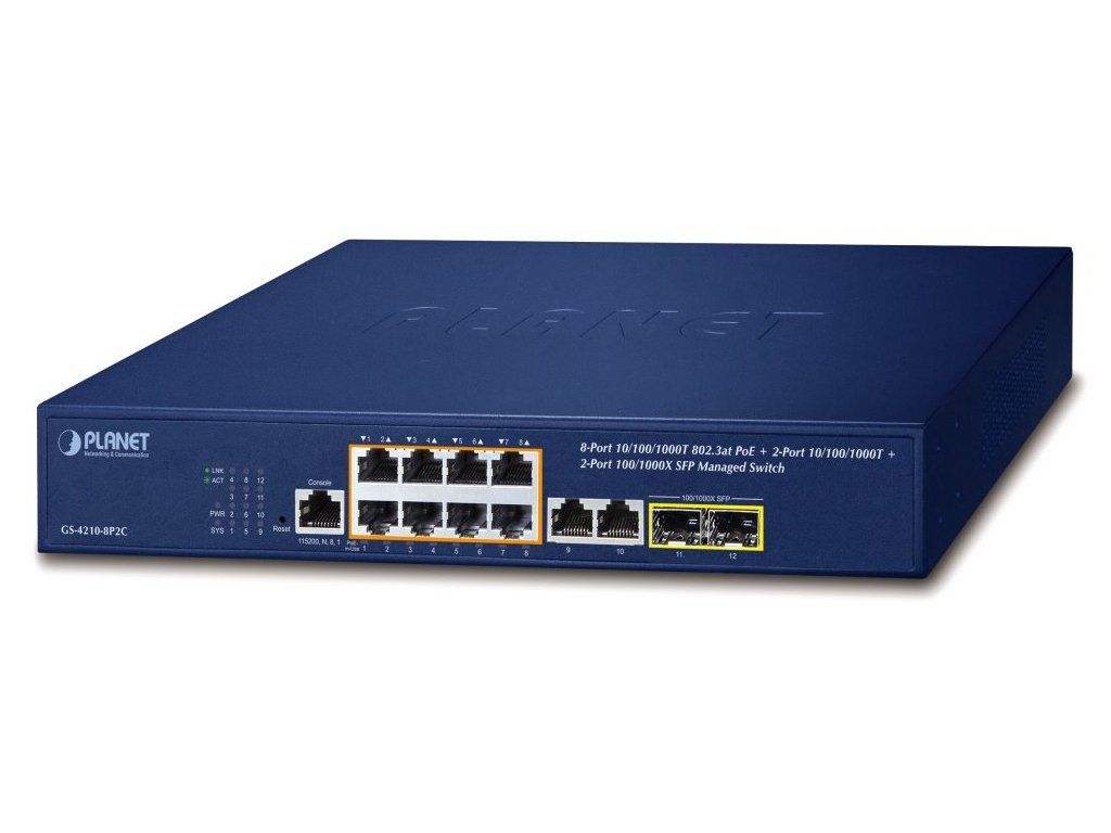 PLANET GS-4210-8P2CSpravovatelný PoE přepínač nabízí 10 portů 10/100/1000 Base-T a 2 SFP sloty 100/1000 Base-X. Z toho 8 portů podporuje 802.3at PoE+ (port 1-8).