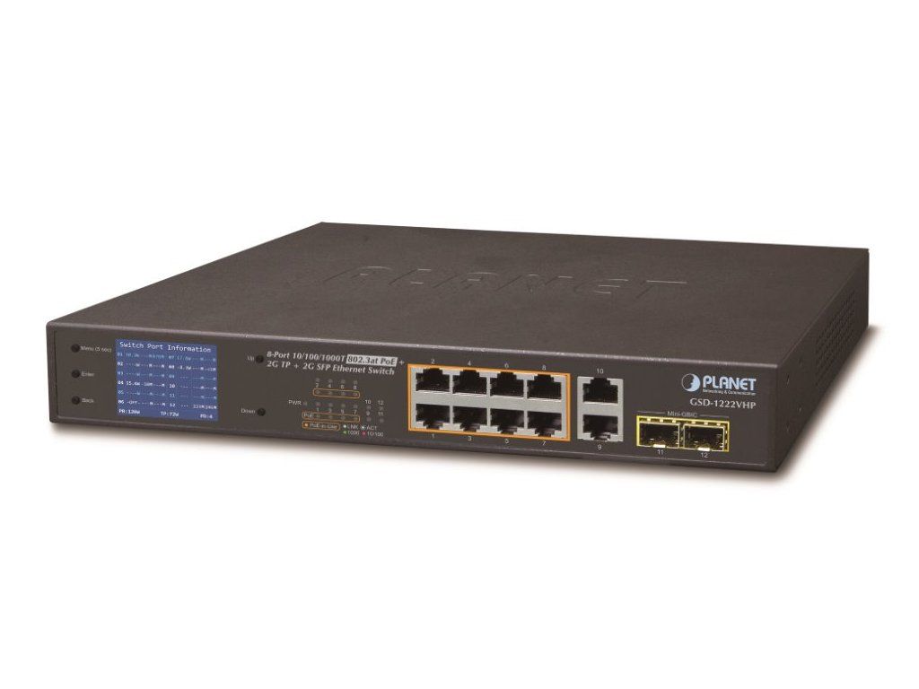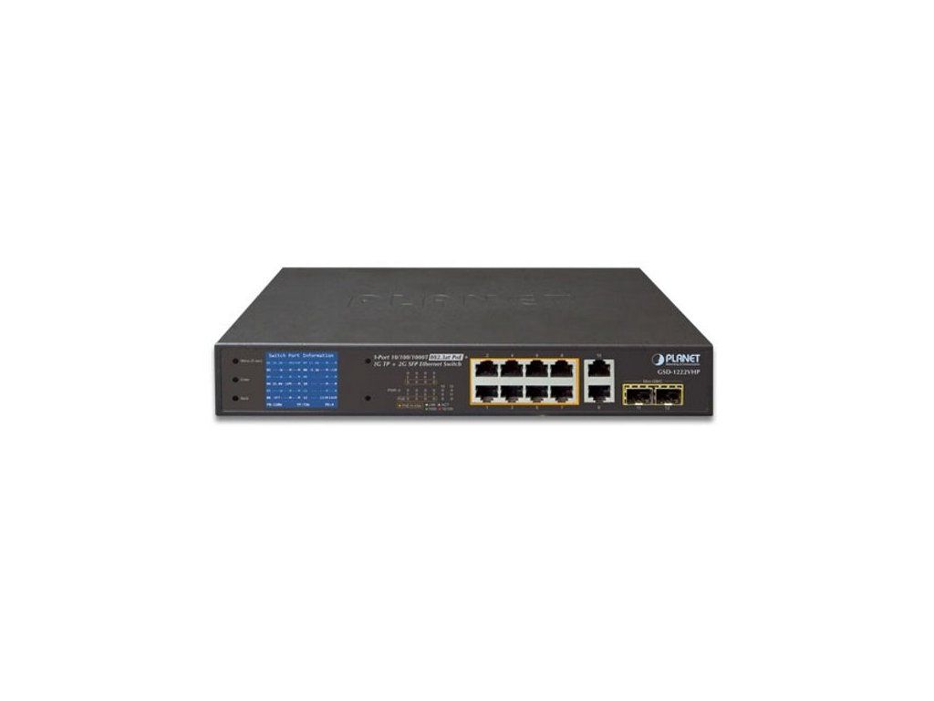 Planet GSD-1222VHP PoE switch, 8x PoE + 2x 1000Base-T + 2x SFP, LCD,VLAN, extend mód 10Mb do 250m, IEEE 802.3at 120W