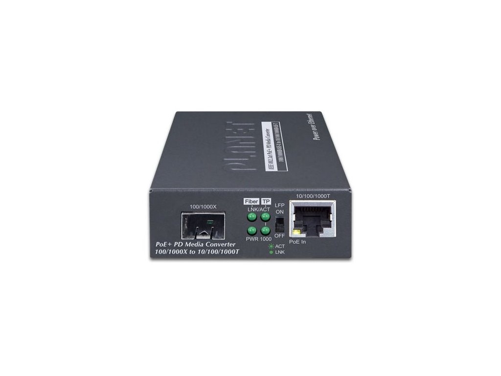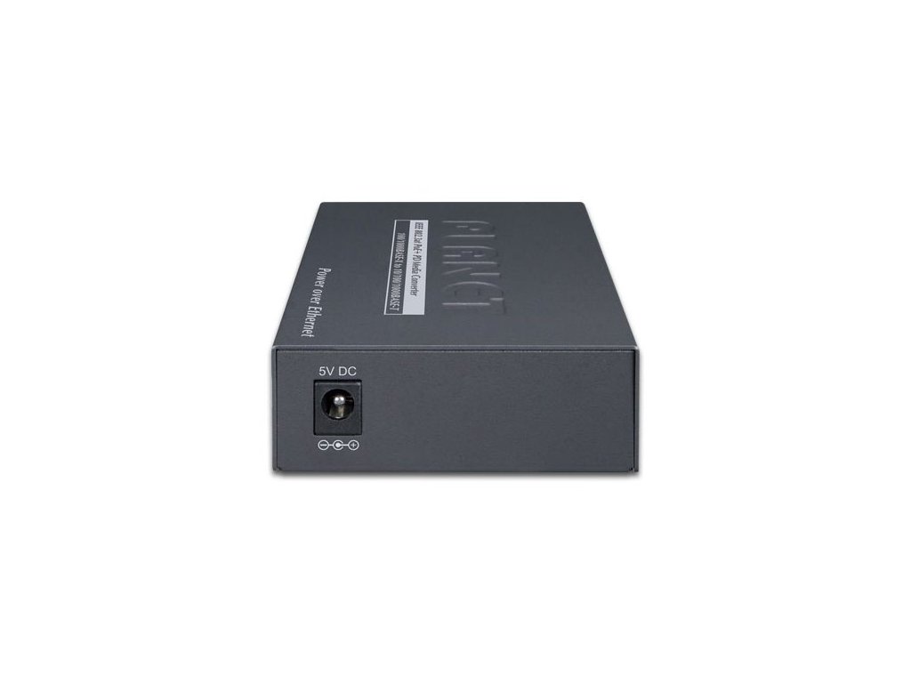 PLANET GT-805A-PDPoE+/PoE++ konvertor Ethernet RJ-45 10/100/1000 Base-T na optiku miniGBIC (SFP 100/1000 Base-X). Převádí metalický Ethernet na optický Gigabitový Ethernet přes vložený modul konvertoru miniGBIC (SFP).
