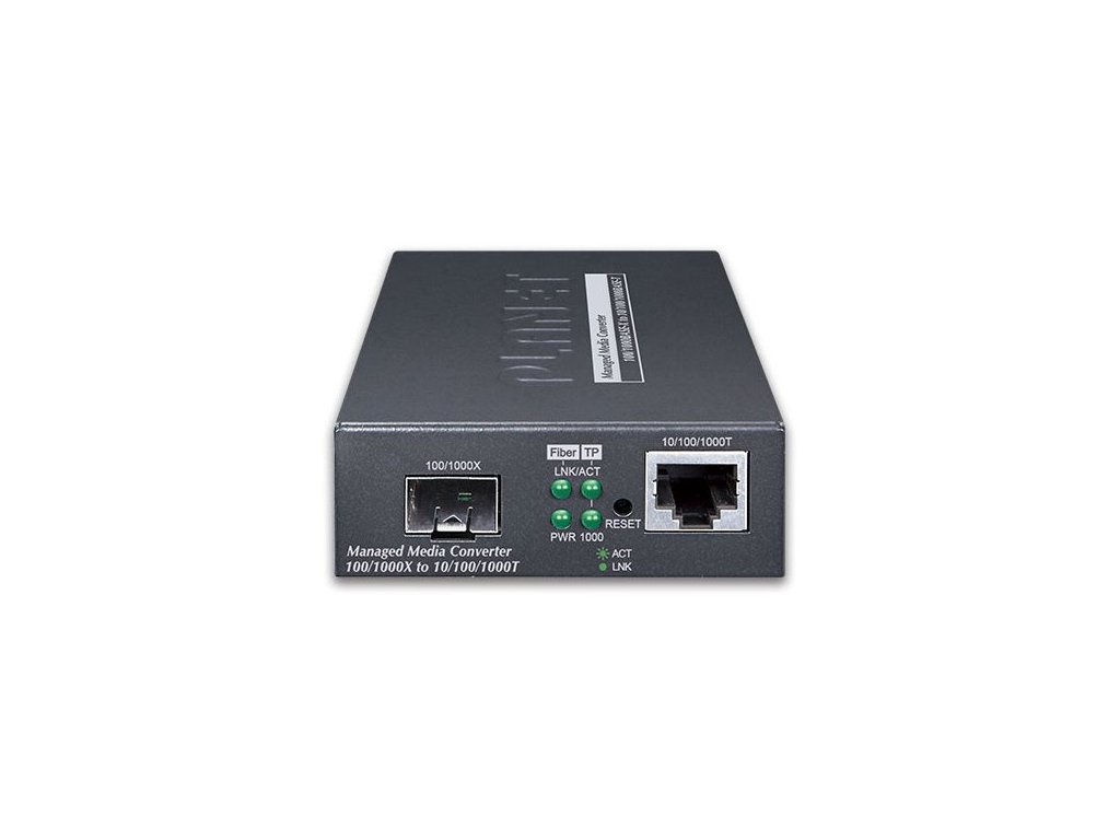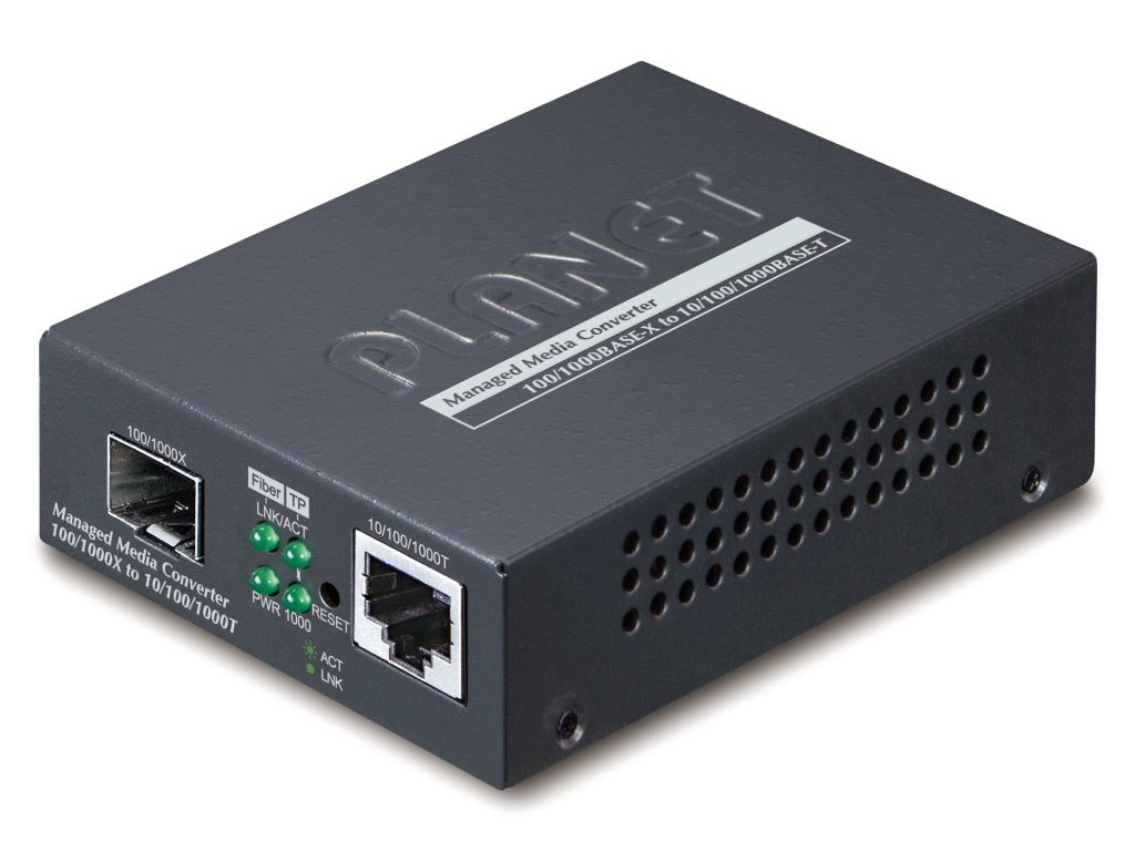 PLANET GT-915AKonvertor Ethernet RJ-45 10/100/1000 Base-T na optiku miniGBIC (SFP 100/1000 Base-X). Převádí metalický Ethernet na optický Gigabitový Ethernet přes vložený modul konvertoru miniGBIC (SFP).