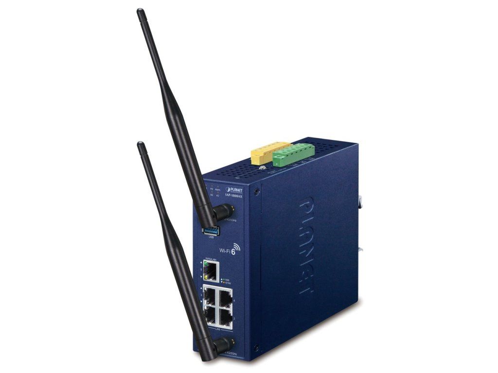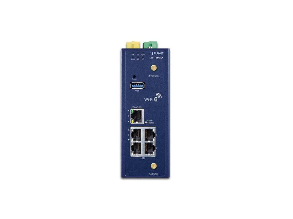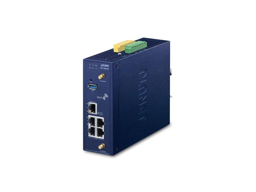 PLANET IAP-1800AXUltrarychlý průmyslový Wi-Fi 6 přístupový bod 802.11ax 1800Mb/s s integrovaným 5portovým přepínačem. Krytí IP30, pracovní teplota -40 až +75 °C, montáž na DIN lištu nebo přímo na zeď. Možnost duálního napájení v rozsahu DC 9-54 V (max. 1,8 A).