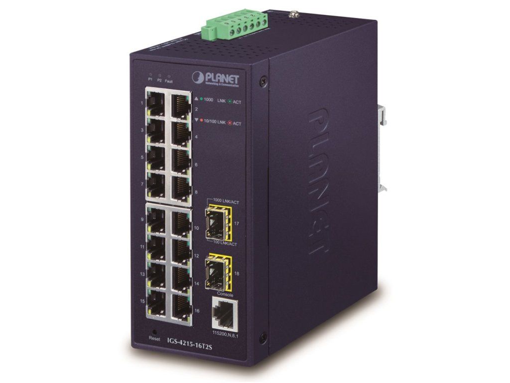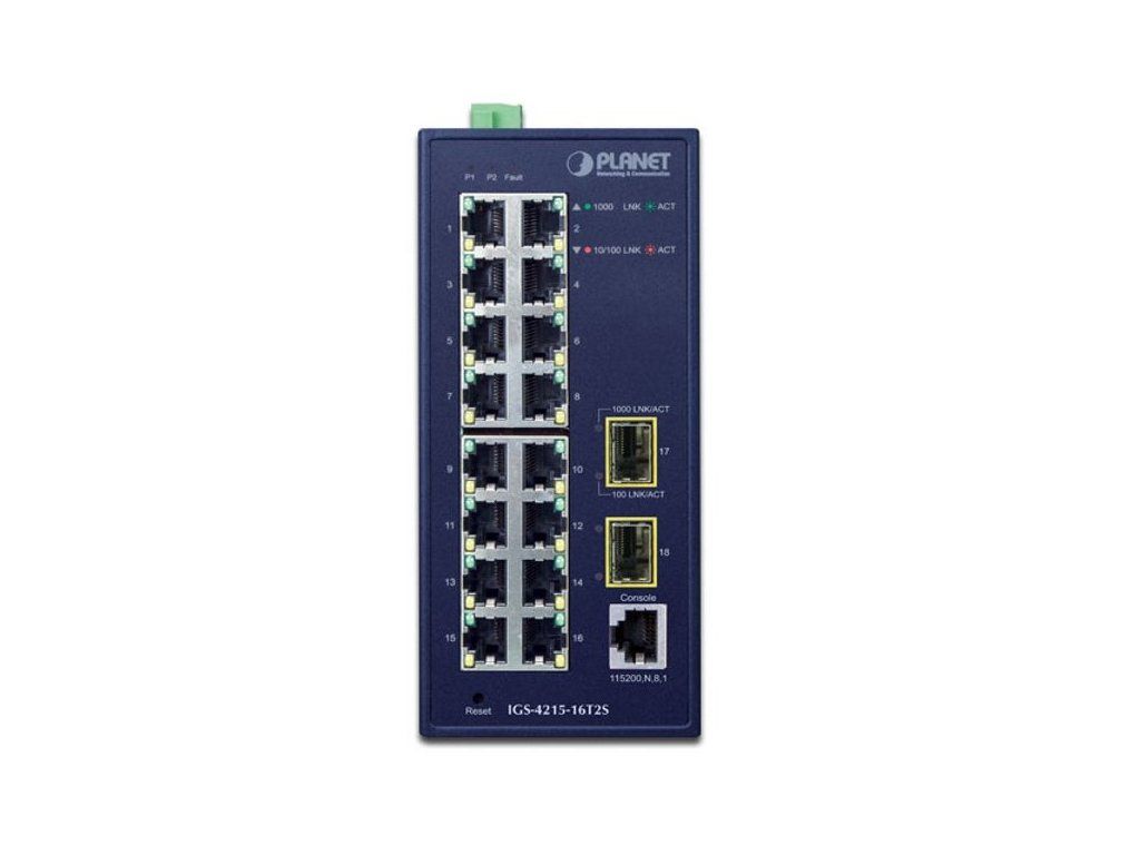 PLANET IGS-4215-16T2SPrůmyslový spravovatelný přepínač 16x RJ-45 10/100/1000Base-T, 2x SFP 100/1000Base-SX/LX/BX (diagnostika DDM).
