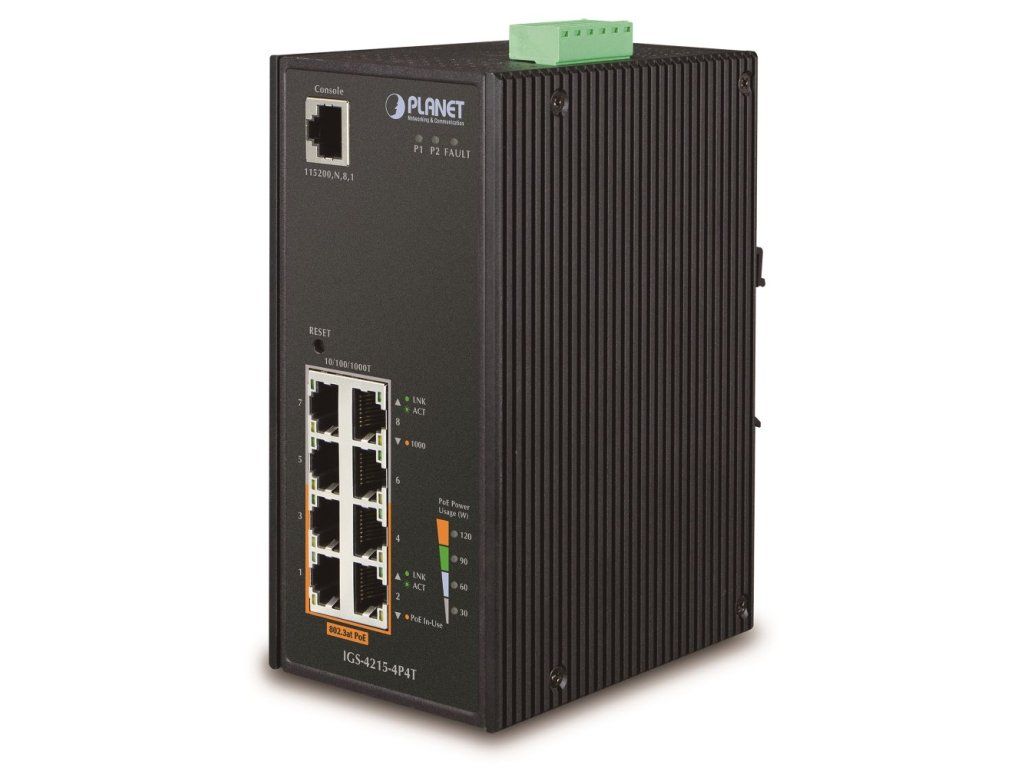 PLANET IGS-4215-4P4TPrůmyslový spravovatelný PoE přepínač 8x 10/100/1000Base-T, z toho 4x PoE IEEE 802.3af injektory, výkon až 140W.
