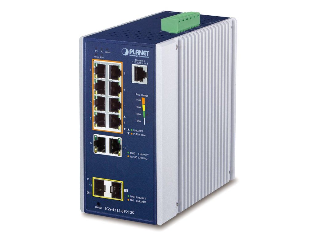 PLANET IGS-4215-8P2T2SPrůmyslový L2 PoE spravovatelný switch 10× RJ-45 10/100/1000 Base-T, 2× SFP 100/1000 Base-SX/LX/BX (diagnostika DDM). Porty 1–8 podporují PoE+ napájení (802.3af/802.3at), celkový výkon 240 W (pro max. výkon je třeba duální napájení o stejném napětí, např. 2× DC 54 V).