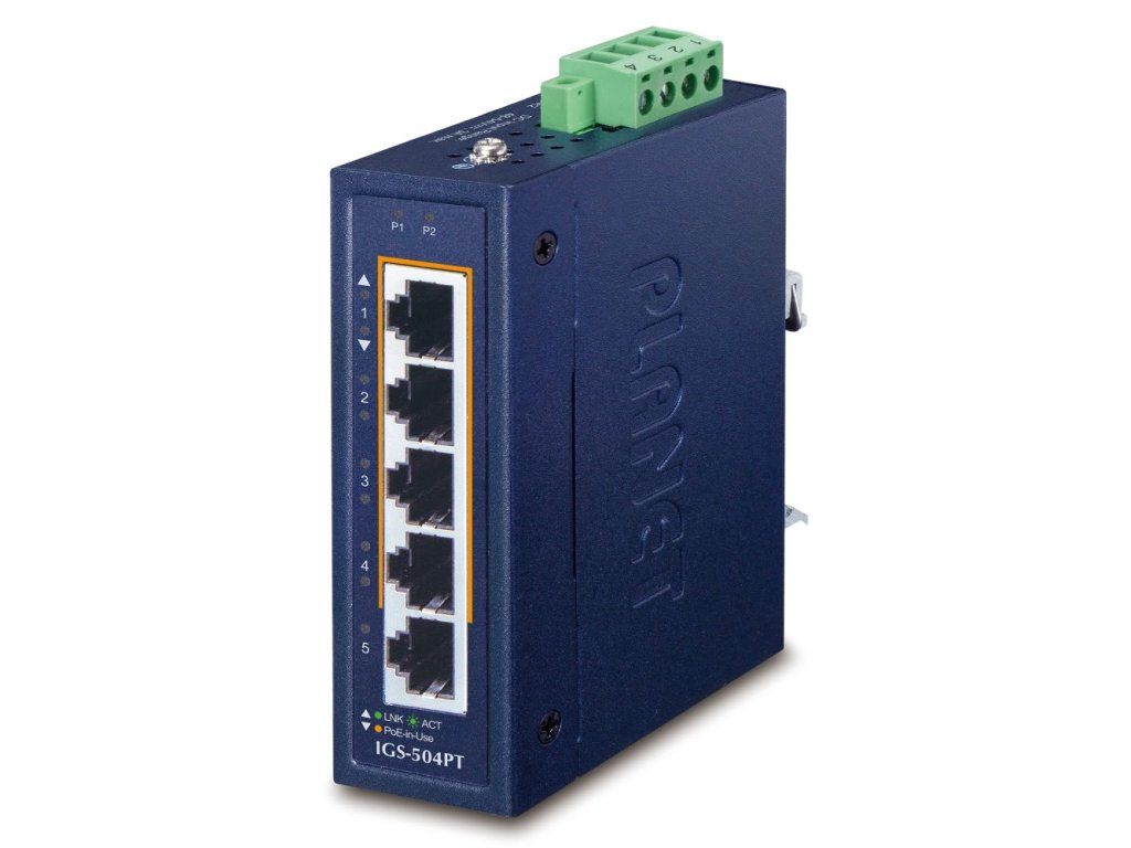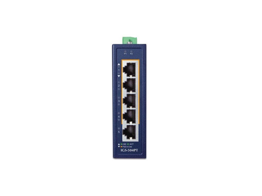 PLANET IGS-504PTPrůmyslový mini switch nabízející 5x RJ-45 10/100/1000 Base-T port, z toho čtyři porty s podporou PoE+ (802.3af/at) napájení až 30 W na port a celkový napájecí PoE výkon 120 W.