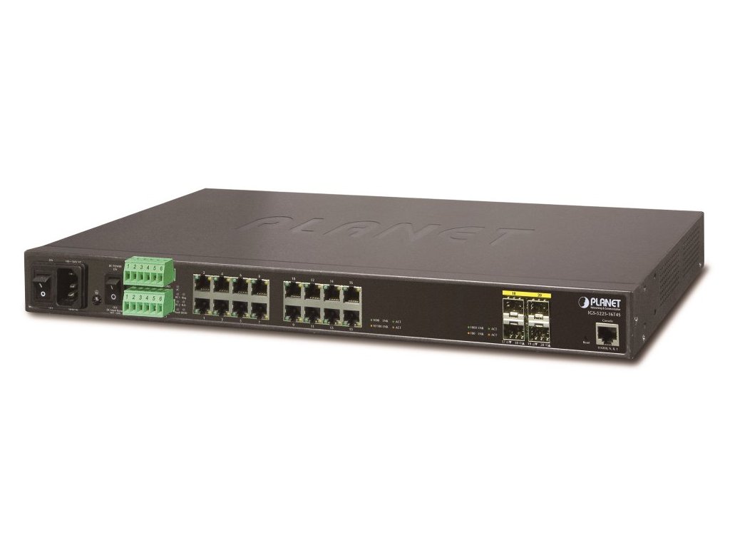 PLANET IGS-5225-16T4SPrůmyslový spravovatelný L3 přepínač 16x 10/100/1000Base-T, 4x SFP 100/1000Base-X (diagnostika SFP-DDM), 2x DI/DO.