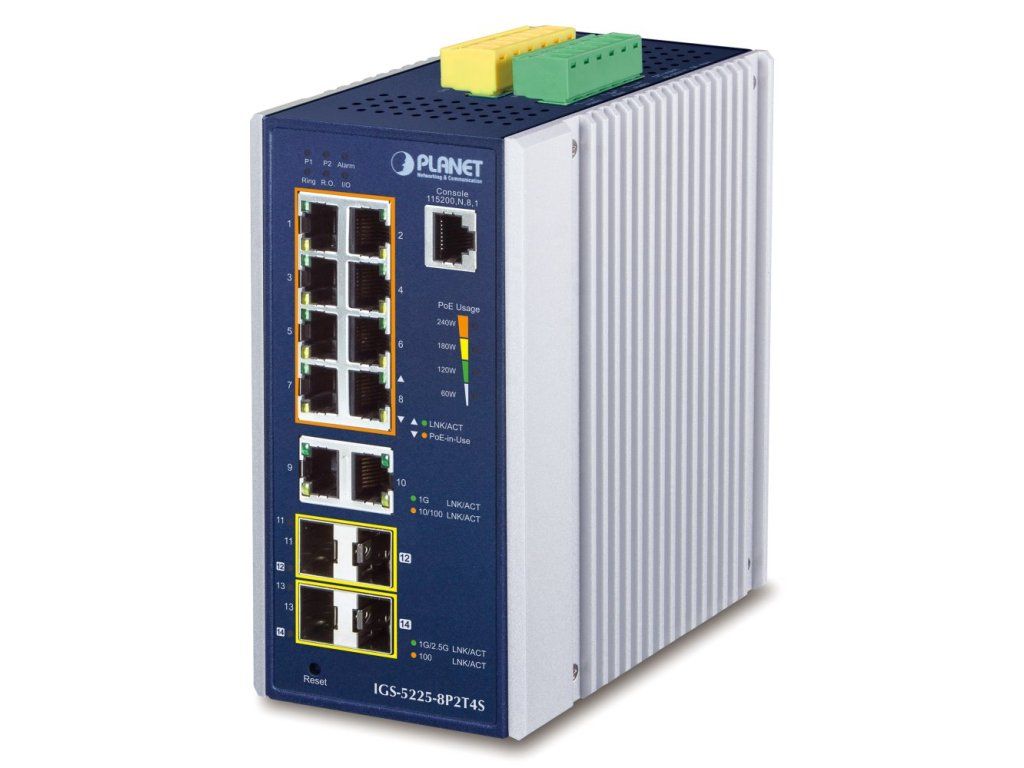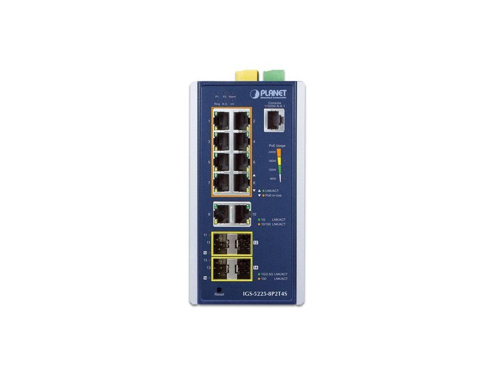 Planet IGS-5225-8P2T4S průmyslový L3 switch, 8x1Gb, 2x1Gb SFP, 2x2.5Gb SFP, 8x PoE 802.3at 240W, dual 48-54VDC, -40~75°C