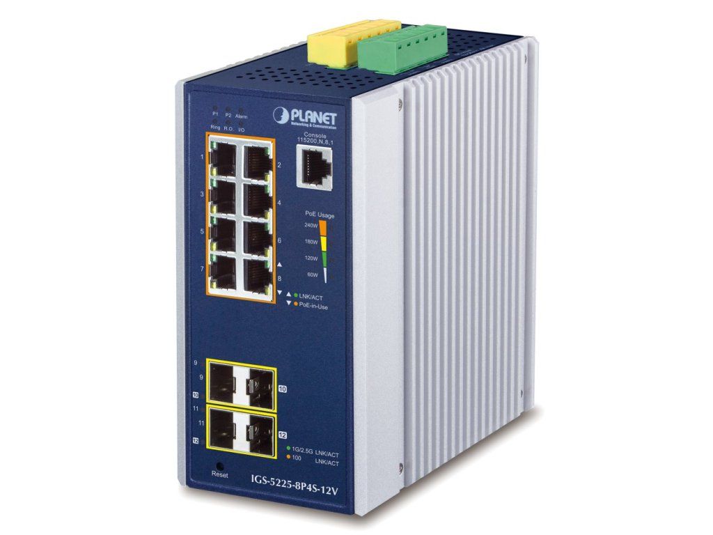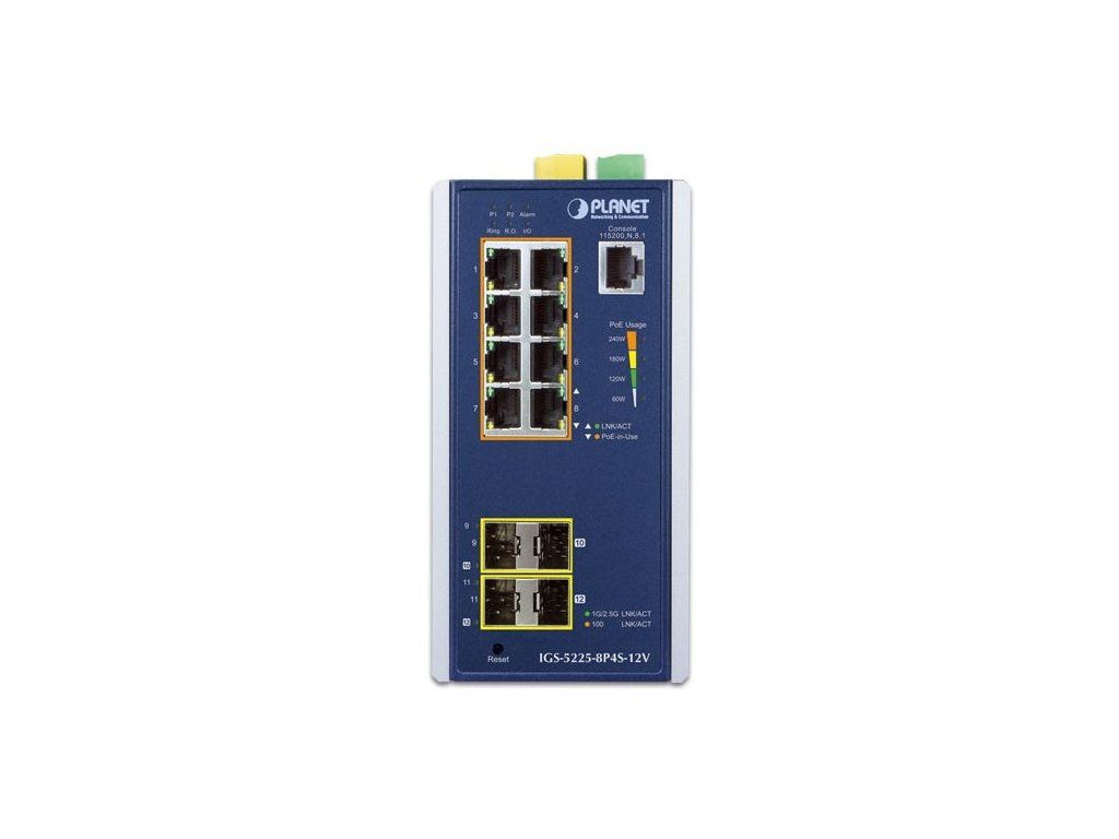 Planet IGS-5225-8P4S-12V průmyslový L3 switch, 8x1Gb, 2x1Gb SFP, 2x2.5Gb SFP, 8x PoE 802.3at 240W, 12-54VDC, -40~75°C