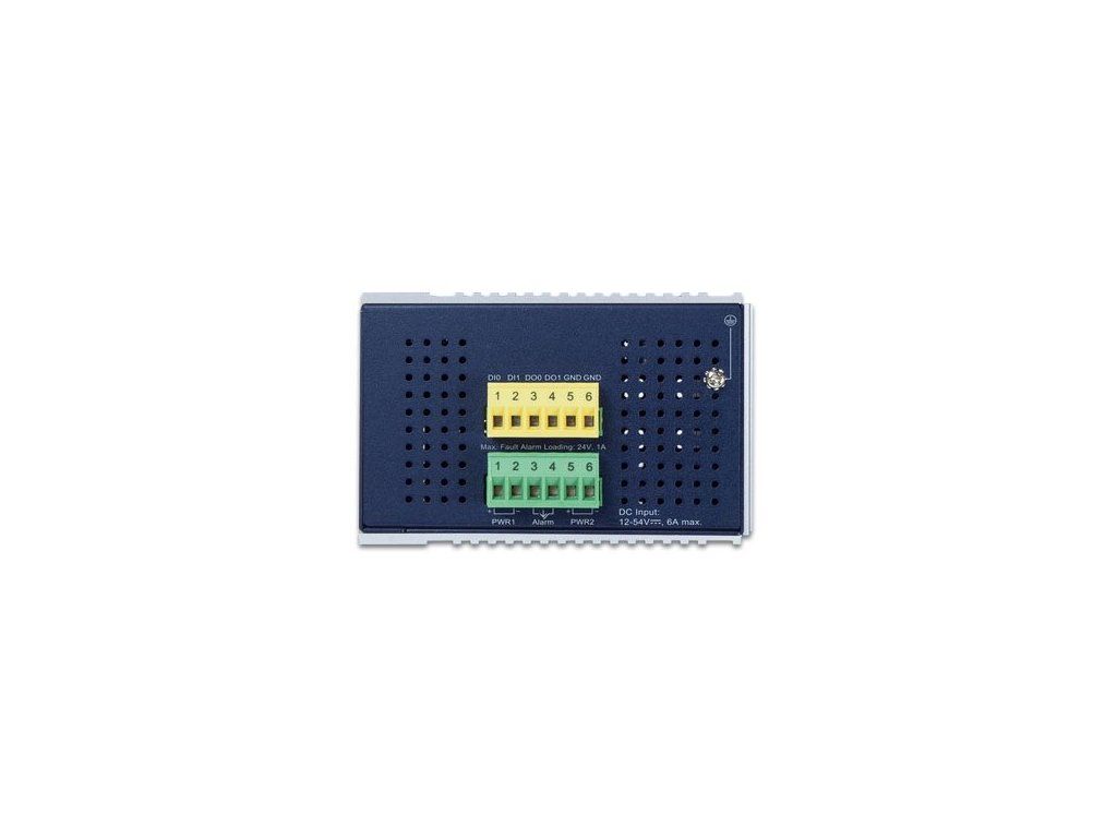 Duální napájení v rozsahu DC 12-54 V, krytí IP30, hliníková skříň, pracovní teplota -40 až +75 °C, přepěťová ochrana ESD do 6 kV, DI/DO (2x digitální vstup, 2x digitální výstup), 1x alarm (napájení), montáž na DIN lištu nebo přímo na zeď.