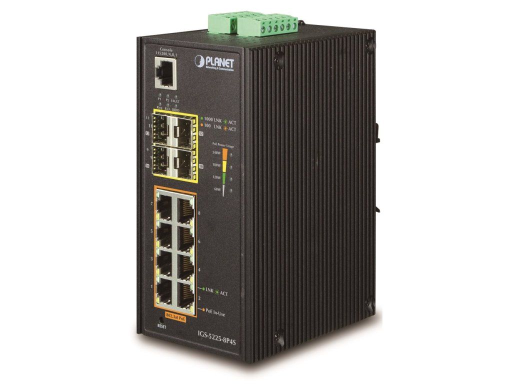 Planet IGS-5225-8P4S průmyslový L3 switch, 8x1Gb, 4x1Gb SFP, 8x PoE 802.3at 240W, dual 48-54VDC, -40~75°C, IP30