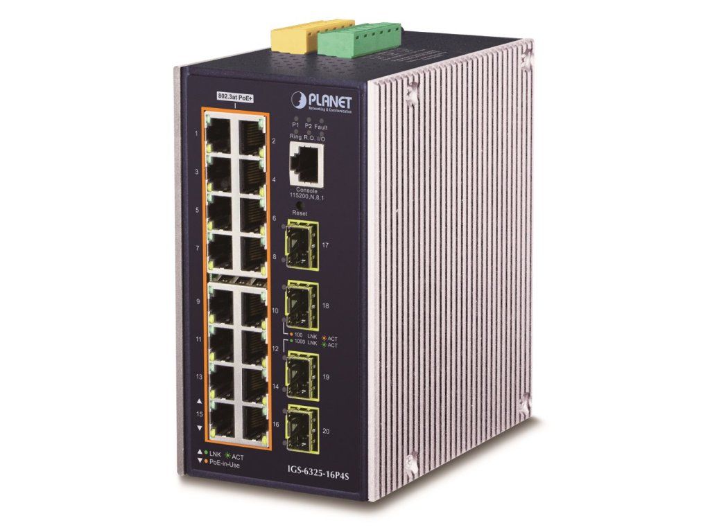 PLANET IGS-6325-16P4SPrůmyslový L3 PoE+ switch obsahující 16 x RJ-45 10/100/1000Base-T 802.3at PoE+ a 4 x SFP/mini-GBIC slot (1000Base-SX/LX/BX SFP). Navíc je vybaven interním ONVIF modulem pro detekci a info IP kamer v síti.