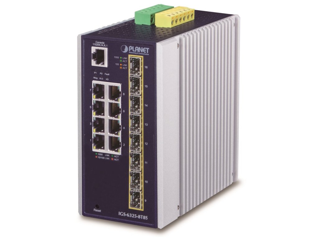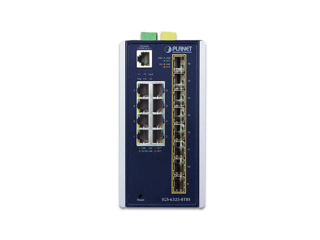 PLANET IGS-6325-8T8SPrůmyslový přepínač a konvertor 8x 10/100/1000Base-T, 8x SFP 100/1000Base-X.