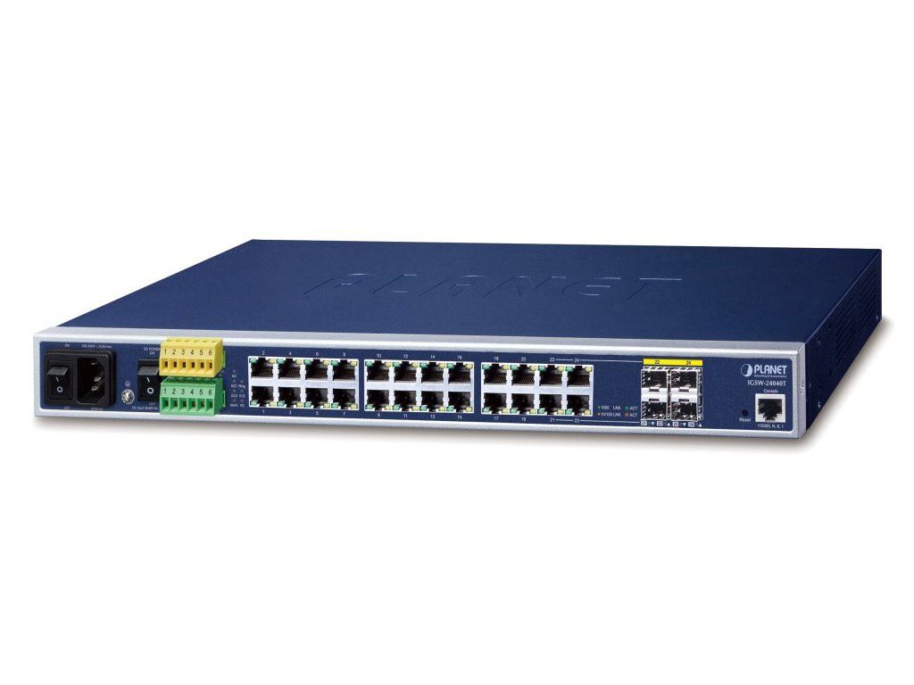 PLANET IGSW-24040T v424portový L2/L3 gigabitový spravovatelný přepínač pro průmyslové aplikace, 24x RJ-45 10/100/1000 Base-T, 4x SFP 100/1000 Base-X/FX sdílené sloty s porty 21-24 (combo porty), 1x RJ-45 konzolový port (RS-232), 2x DI/DO. Využívá uživatelsky komfortní design "Front Access" pro snadné zapojení a údržbu při umístění v rozváděči.