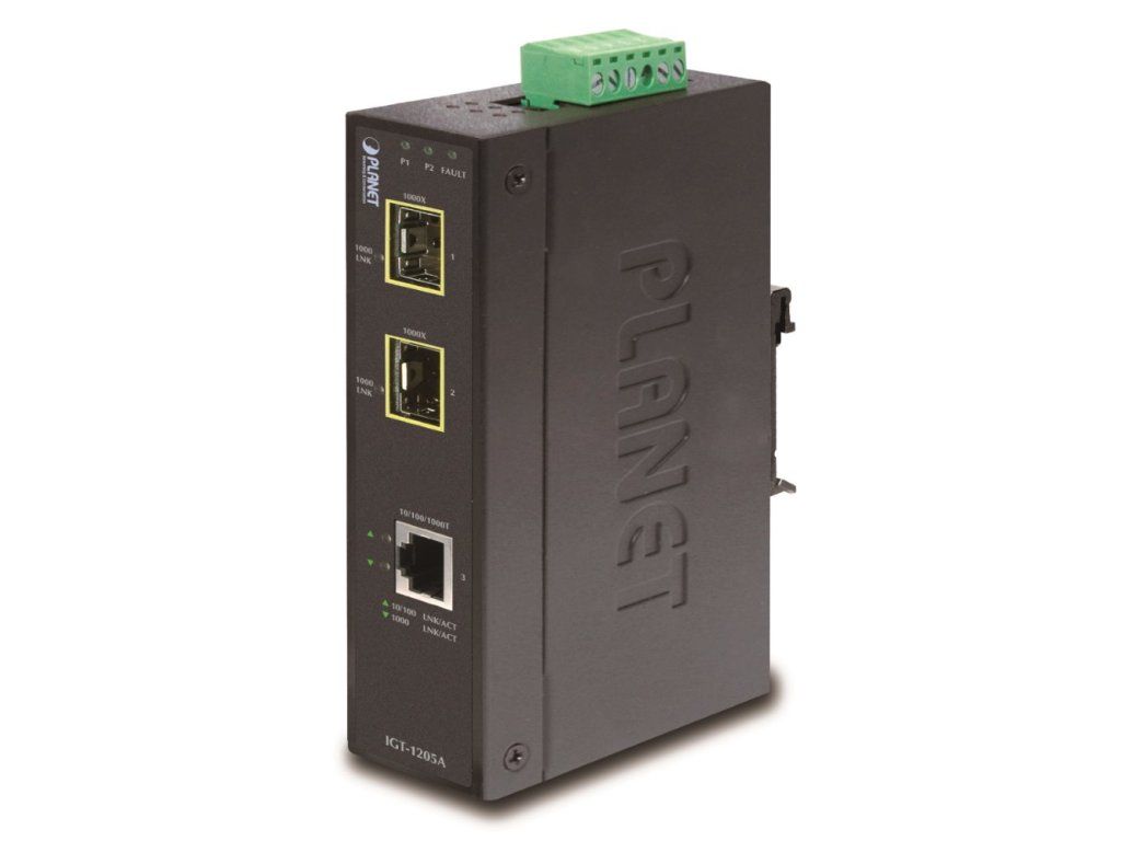PLANET IGT-1205ATKonvertor ethernet 1000Base-T na optiku 100/1000Base-X se sloty SPF pro instalaci MFB a MGB modulů, určený pro průmyslové a FTTH aplikace.
