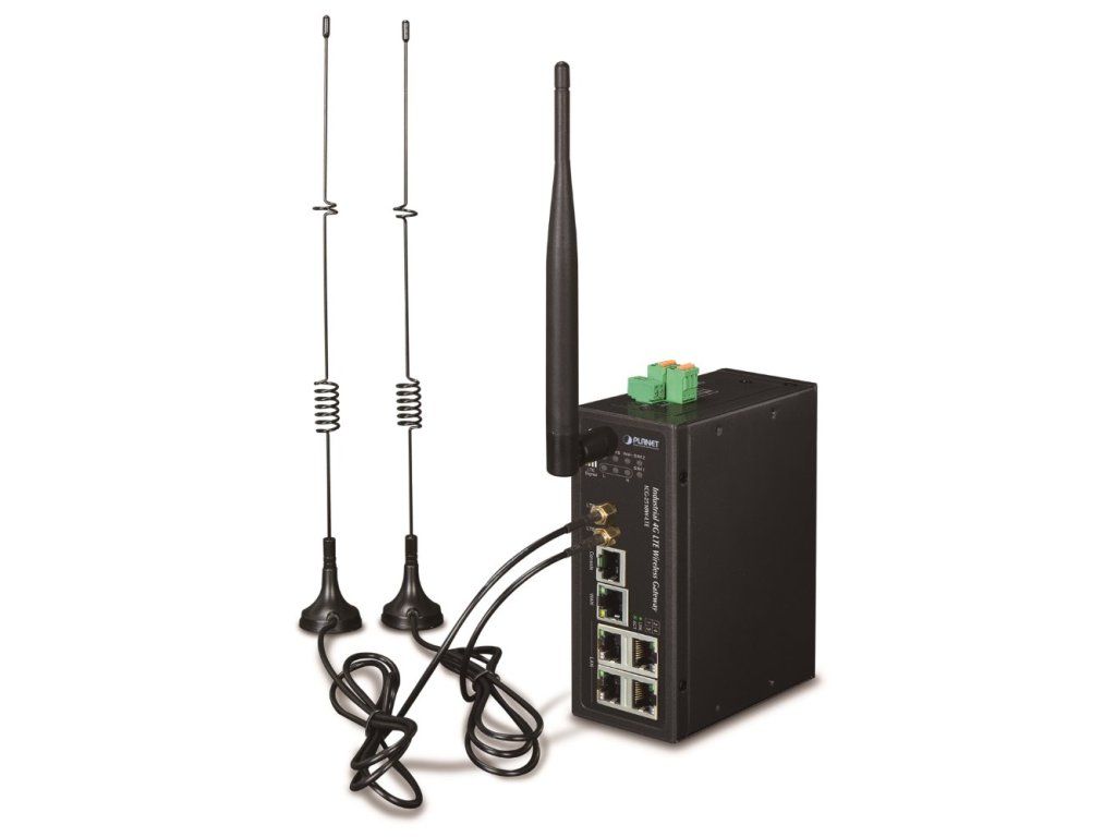 PLANET ICG-2510W-LTEPrůmyslová brána LTE infrastruktury IoT/M2M, 1x WAN, 4x LAN, 1x RJ-45 (DB9), 2x digitální vstup DI, 1x digitální výstup DO, 2x SIM slot, 2x 5dbi anténa (SMA konektory, mobilní sítě 2G/3G/4G/LTE), 1x 1dbi anténa (RP-SMA-J), 1x microSD slot.
